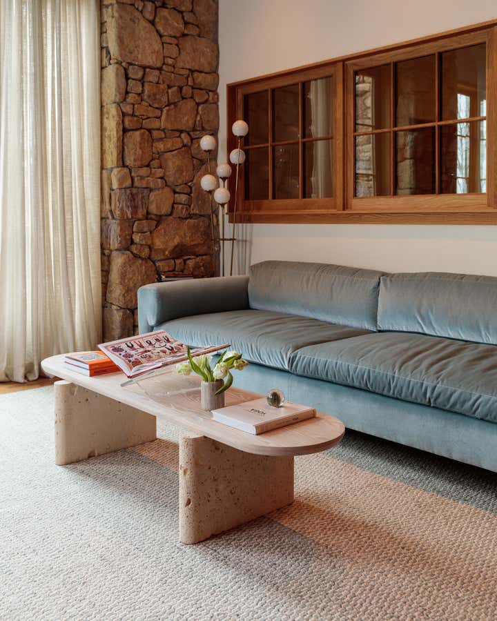 Designed for calm and comfort, this spa creates a perfect setting to pause, relax and recharge. A soft blue and monochromatic color palette was chosen to bring the outdoors in. A modern sofa covered in blue velvet, reclaimed white oak flooring and plaster vaulted ceilings create a soft, peaceful atmosphere for spa-goers. An antique center table sits in the spa entrance, and vintage Italian light fixtures hang throughout the space.