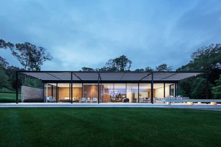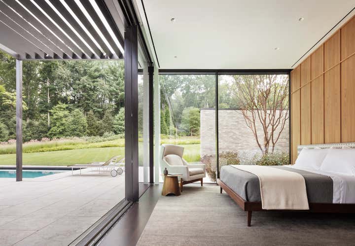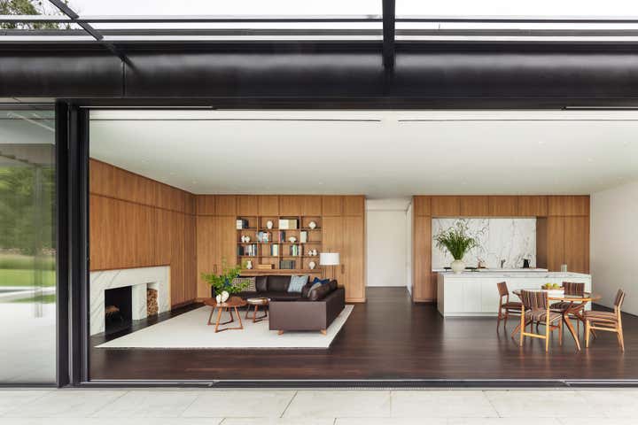 Inspired by the classic modernism of New England, particularly the work of the Harvard Five, this simple guest pavilion is designed to take in views of a pond on the eight-acre property. A muted gray brick façade greets visitors with overlapping planes that create an intriguing oblique entrance. Inside, the expansive view is revealed through floor-to-ceiling sliding window walls with ultra-thin profiles. The open kitchen and living area is ideal for entertaining. The interiors are kept deliberately spare with rich, precisely detailed materials, including walnut panels on all the walls, white statuary marble in the kitchen and fireplaces, and roman travertine in the master bathroom. Furnishings are similarly understated classic modern pieces.