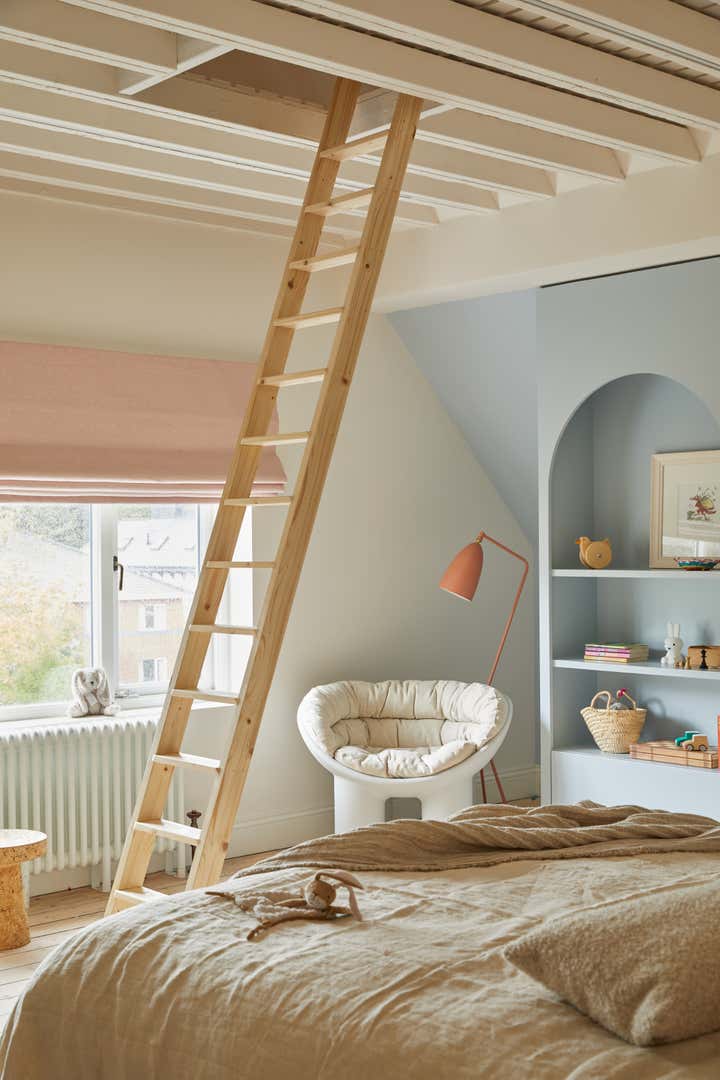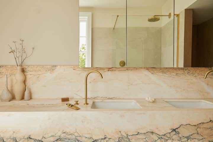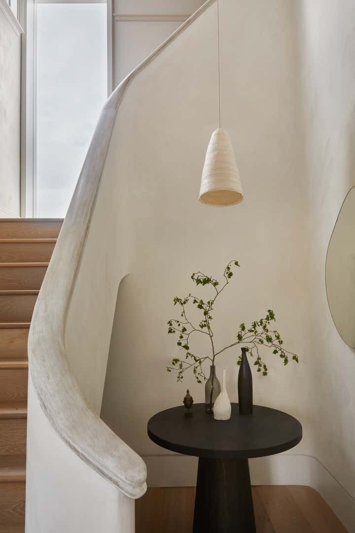 Turning what was a dingy building into a happy family home called for a softening—etching recessed niches for ‘disappearing’ pocket doors, curving corners to make ribbon-like corridors, forming double-height dimensions, and knitting tunnels of natural light into the very fibre of its updated blueprints. Even the split stairway was turned to sculpture, its curvilinear bannister winding up three storeys of restored pinewood floorboards. The effect is as though the interior has been chiselled from stone—a boxy, century-old home sculpted into a suburban sanctuary. Nature grows up around it, with dappling trees to the front and a miniature courtyard jungle at the back, planted with spotlit shrubs and Tasmanian fern.