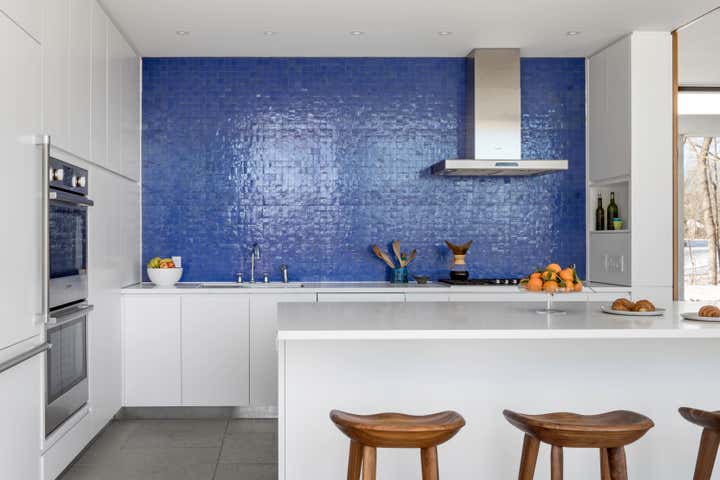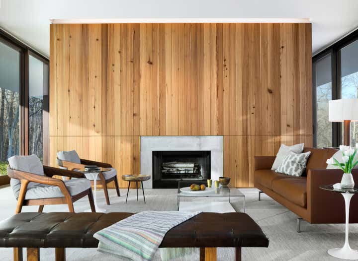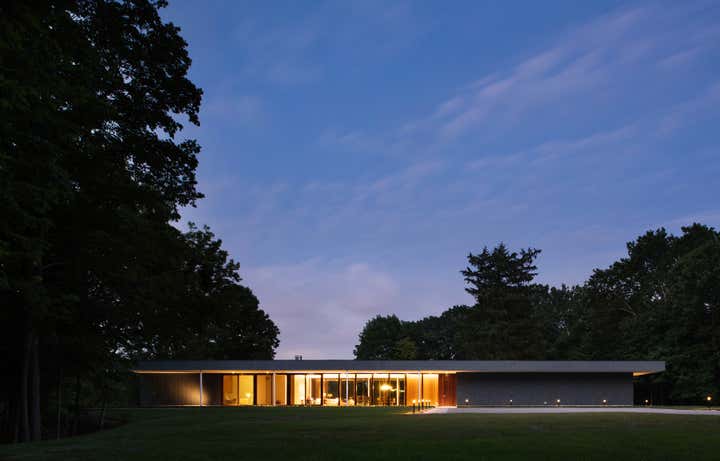 This new 3,500 square foot house is defined by the juxtaposition of its horizontal planes with the dramatic topography of the wooded site, including a sloping landscape at the rear of the house down to a meadow below. A long roof with big overhangs, tall sliding glass doors, and Indiana limestone floors, which extend out to terraces, connect the indoors to the outdoors: the changing seasons become a vibrant backdrop to everyday life. Zinc panels and mahogany doors and windows combine with the light gray pavers in a modern, yet warm palette of materials.