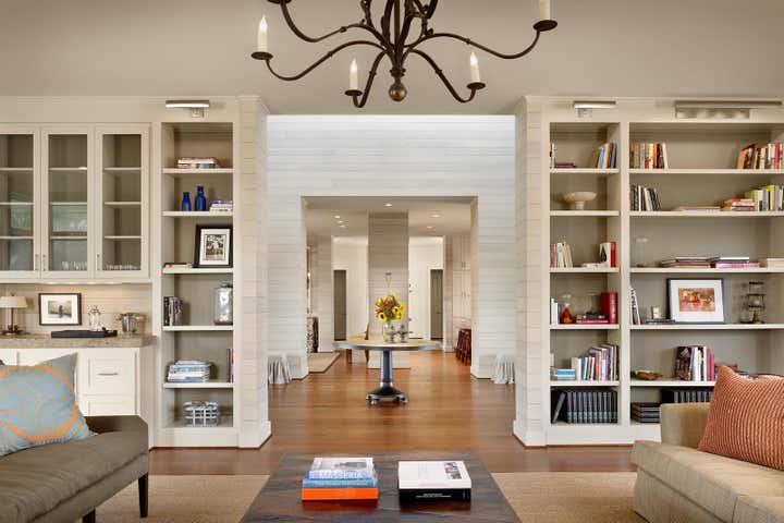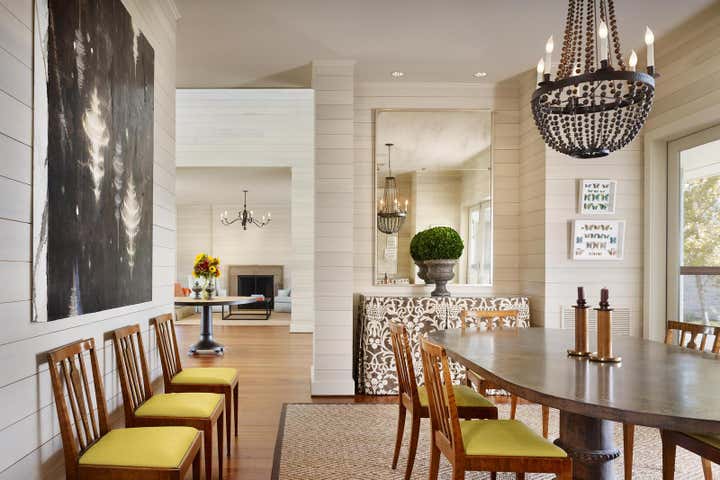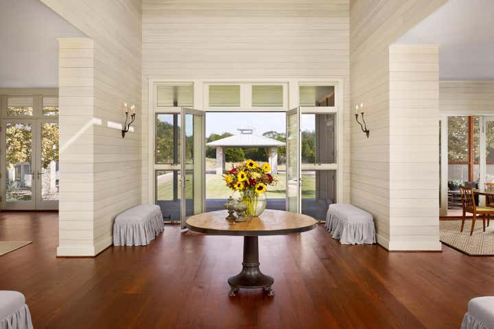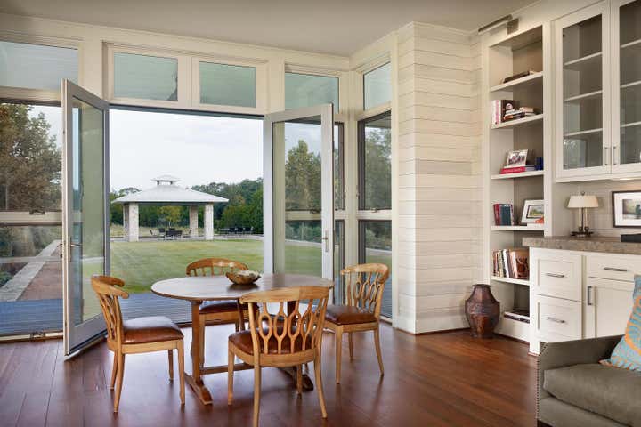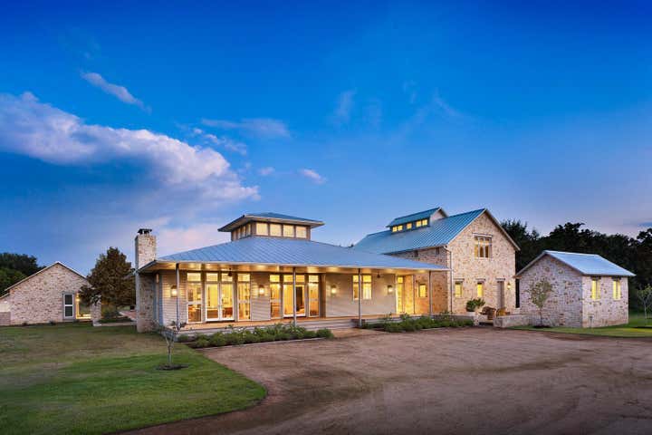 This weekend retreat includes a main house, a guesthouse, and a pool and cabana. As the complex is a place for both getaways and get-togethers, we sited the structures carefully, mindful of balancing the needs for privacy and community. Mixing materials, forms, and scales gives the property a casual atmosphere, as if it were constructed over a period of time. The main house, clad in horizontal metal siding and topped with a low-slung, hipped roof, contrasts with the two-story stone guest cottage, with its steeply pitched, gable roof. The relationship between the buildings and the land was also important; we structured the outdoor space as well as architectural space. To enhance the sense of place, only the grounds enclosed by the buildings were formally landscaped; the surrounding countryside was left in its wild state.