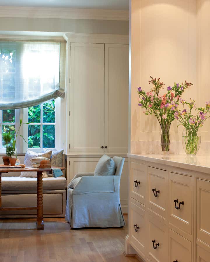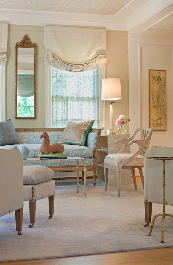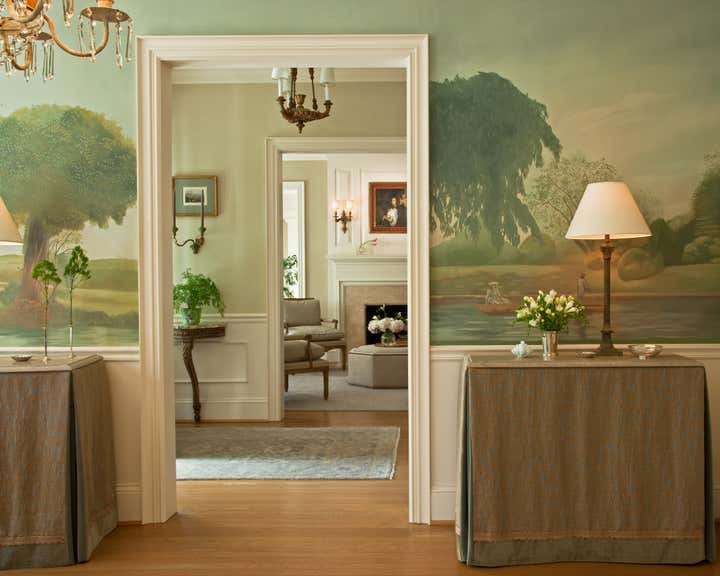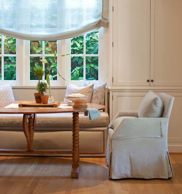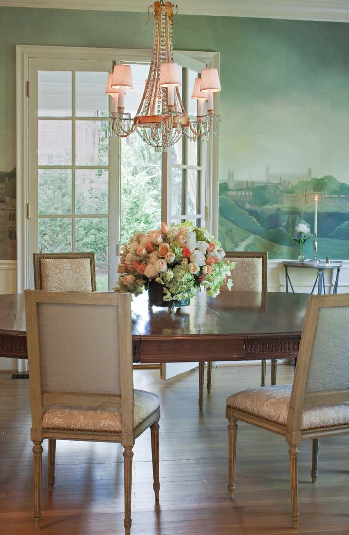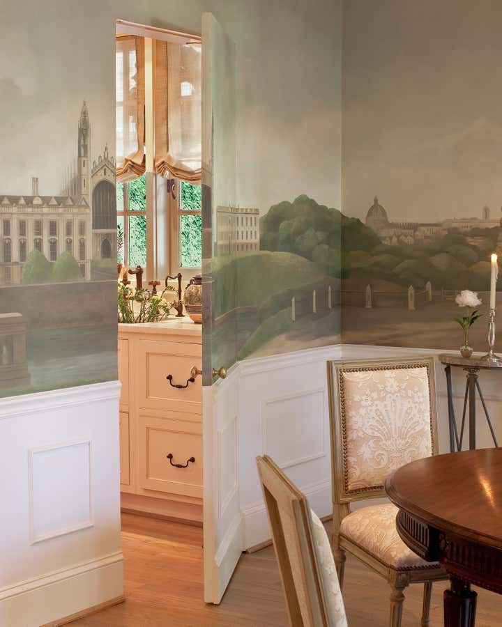 Walking up the slate stepping-stones to this cottage is to cross the threshold into a dreamy environment infused with romantic charm. Solis Betancourt & was asked to open up the floor plan of this Washington home and fill it with soft, atmospheric colors and furnishings that were stylish and classical. In a way, the house tells a love story about its owners, a couple who met in Cambridge, Massachusetts. The dining room mural pays tribute to this locale, and sets the tone for the blues and hazy greens that make up the palette of the overall project.