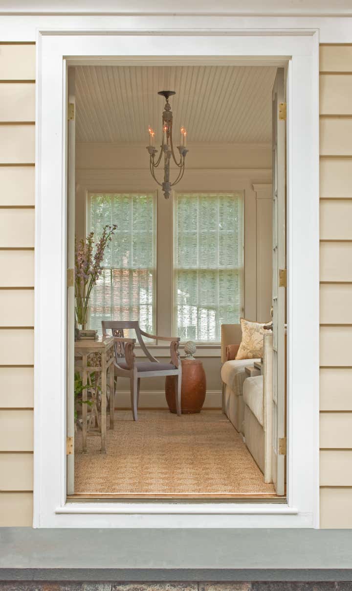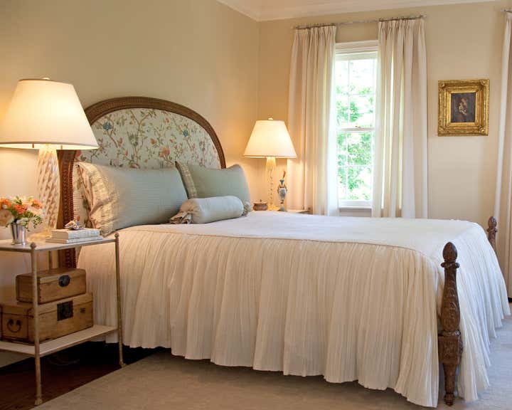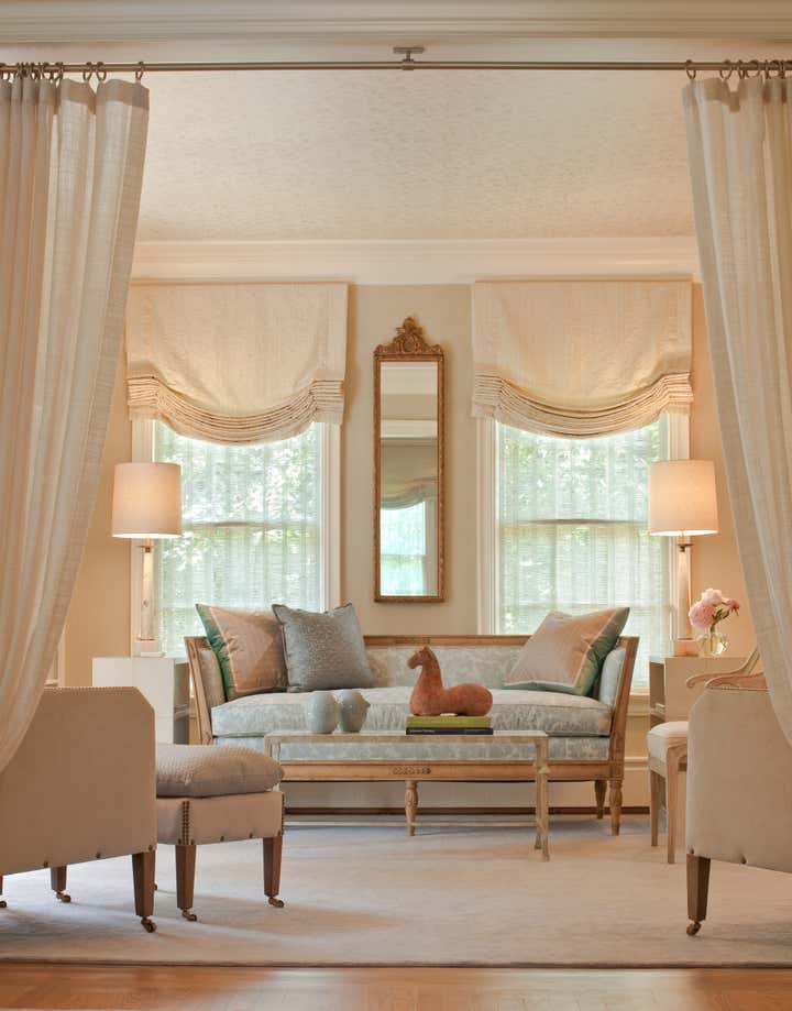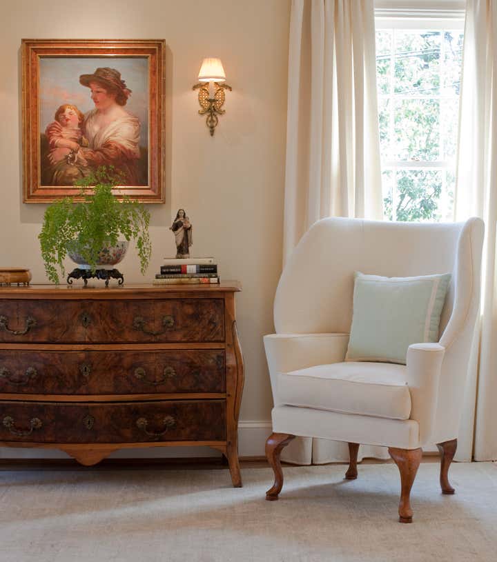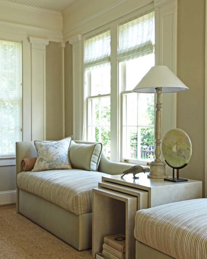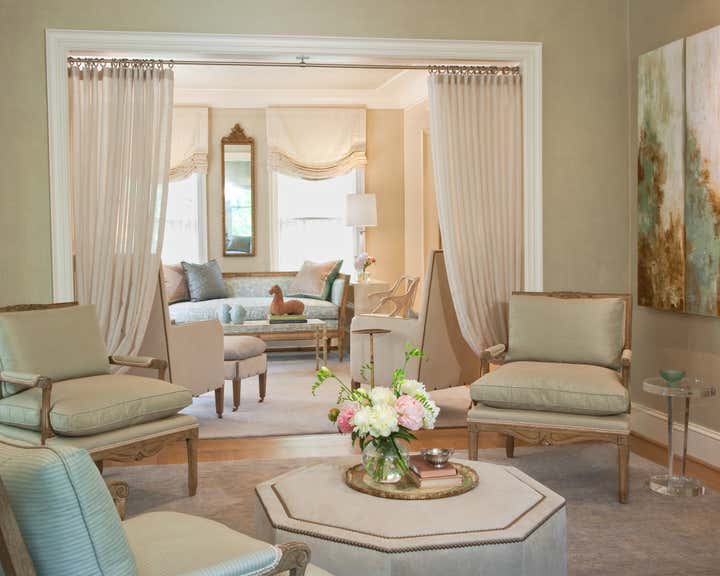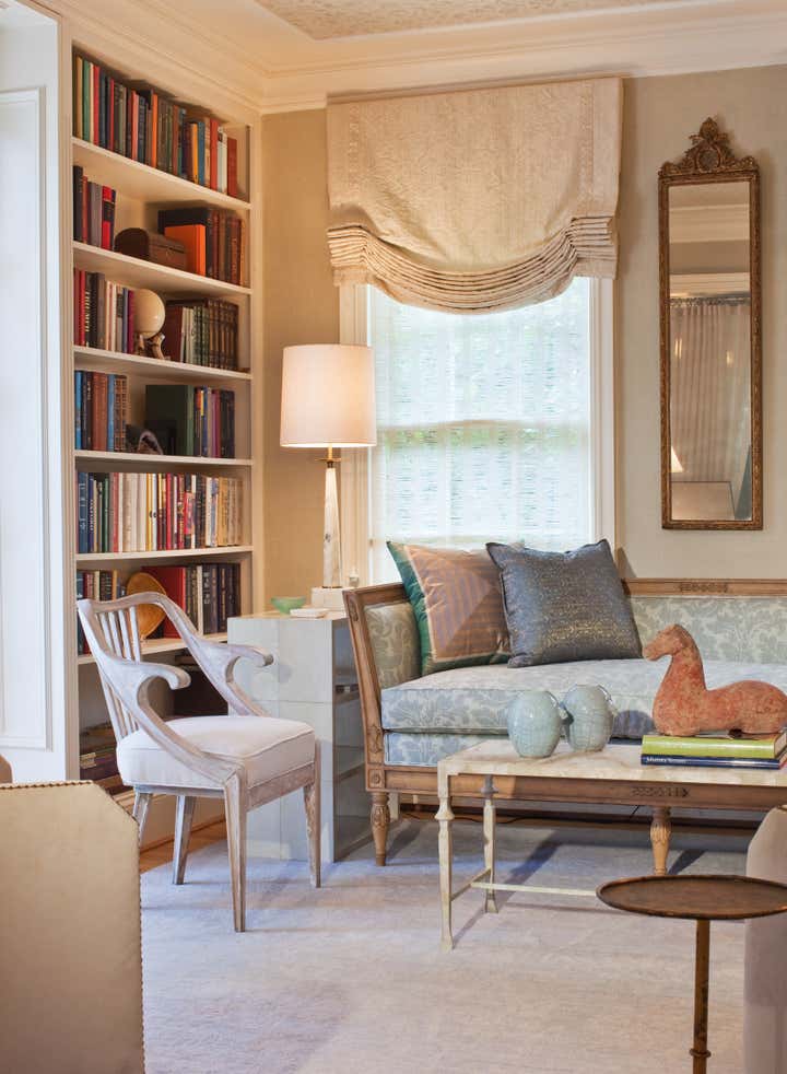 Walking up the slate stepping-stones to this cottage is to cross the threshold into a dreamy environment infused with romantic charm. Solis Betancourt & was asked to open up the floor plan of this Washington home and fill it with soft, atmospheric colors and furnishings that were stylish and classical. In a way, the house tells a love story about its owners, a couple who met in Cambridge, Massachusetts. The dining room mural pays tribute to this locale, and sets the tone for the blues and hazy greens that make up the palette of the overall project.