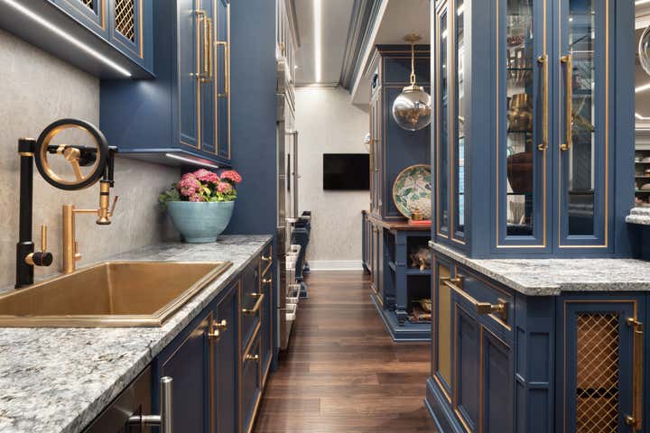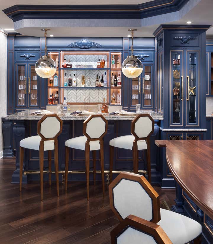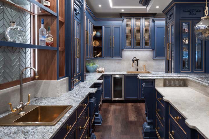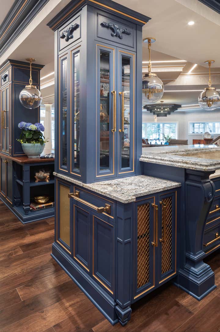 For this bar we wanted to bring in a punch of color and with Oconomowoc Lake on the opposite side, why not reflect the color of the deep blue water. The custom cabinetry, captured by our photographer Ryan Hainey, has details like metal mesh, gold trim inset in the cabinet doors and a contrasting walnut wood interior finish inside the display vitrine cabinets. These details are complimented by exquisite custom designed hardware, bronze and gold plumbing fixtures, and unique decorative and architectural lighting features, making this truly a one of a kind space!