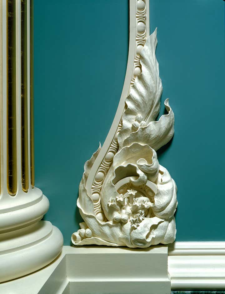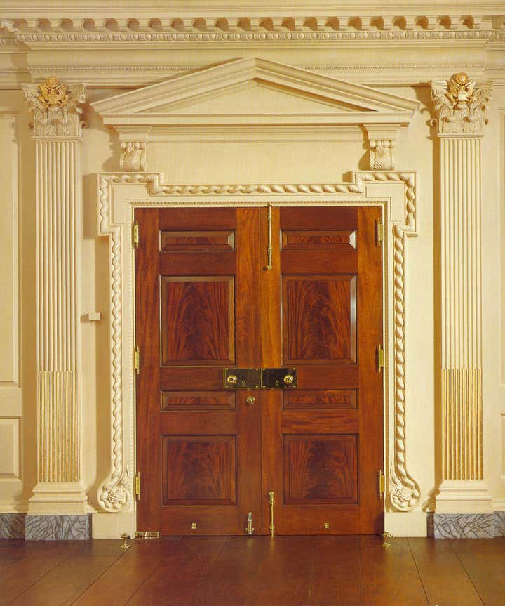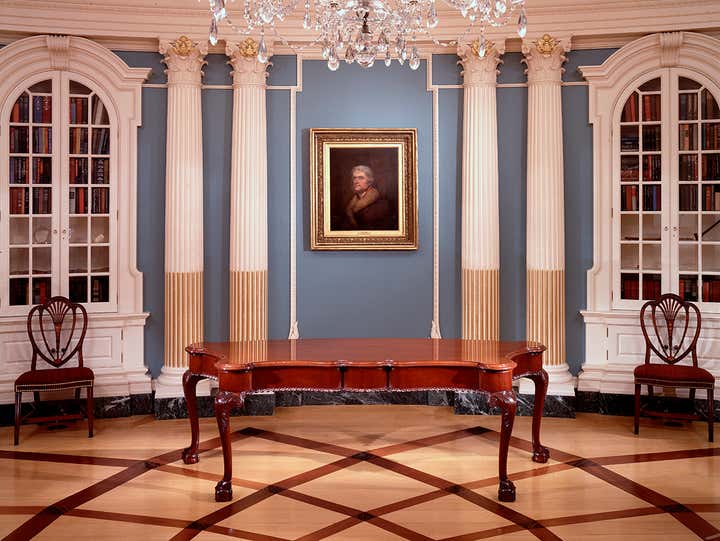 The redesign on the Secretary of State’s offices and the Treaty Room Suite at the U.S. State Department was part of a 38-room commission in which Allan Greenberg Architect was charged with replacing “mediocre modern” rooms, with an architecture that is timeless and distinctly American. Secretary of State George P. Shultz wished to have offices in which Thomas Jefferson - the first Secretary of State - would feel at home in, while also sensing something new. The elliptical Treaty Room is articulated by Corinthian columns which incorporate the Great Seal of the United States. Special carvings depict the leaves and flowers of the native American tobacco plant – a reference to the peace pipe ceremony which celebrates a unique North American contribution to the history of peace making. Treaty-signings are accommodated by an oversized table with an elliptical geometry that relates to the curved walls of the room; adjacent antechambers allow guests to observe treaty-signing ceremonies.
