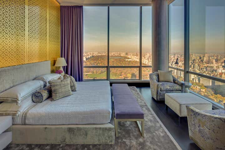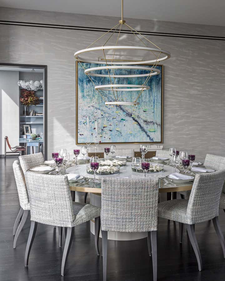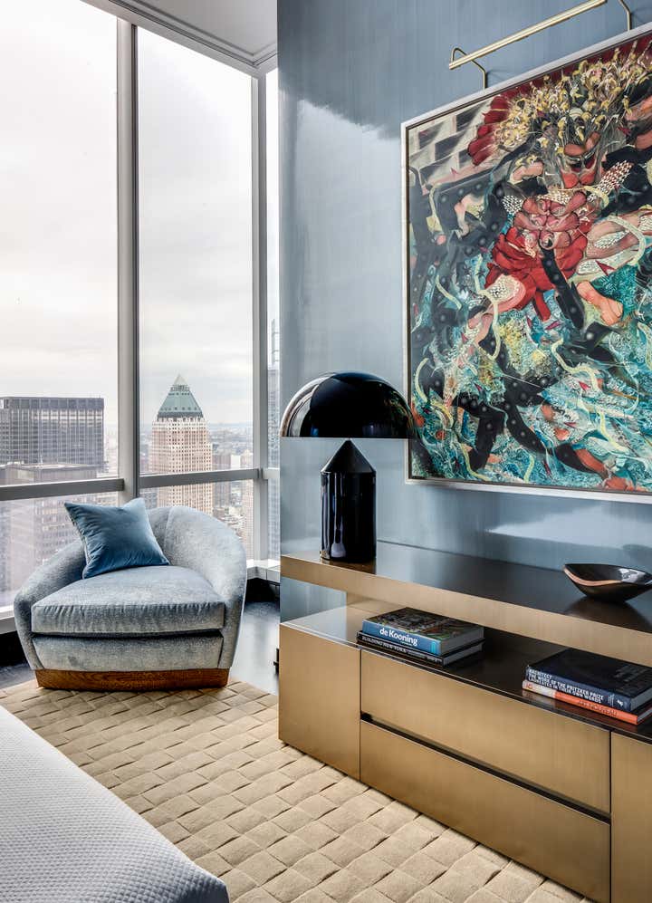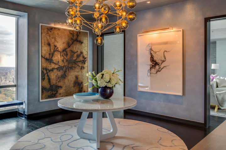 When designing the model apartment of One57, Jamie Drake was asked for something that would appeal to a broad array of prospective buyers, something gender neutral. They welcomed color but didn’t want to be overwhelmed by it. The design is, naturally, all about the views. The foyer introduces you to the tone of the apartment with all of the round shapes, giving off almost a celestial experience of planets and meteor showers. The cosmic theme is carried throughout the apartment, in the luminous wall treatments, metallic details, lacquered woods, and shiny fabrics such as silk, velvet and satin.