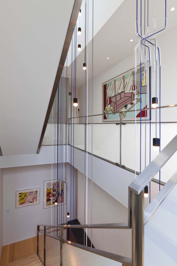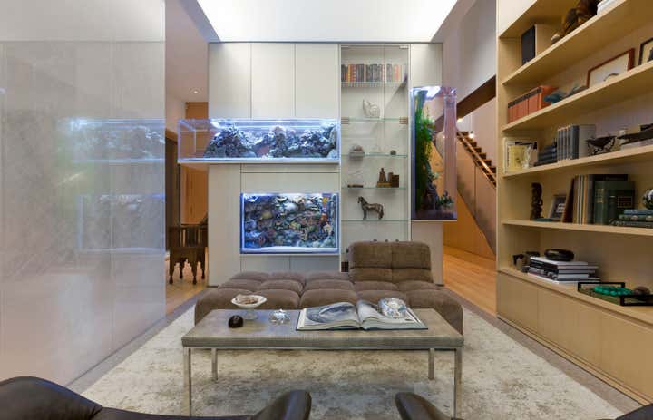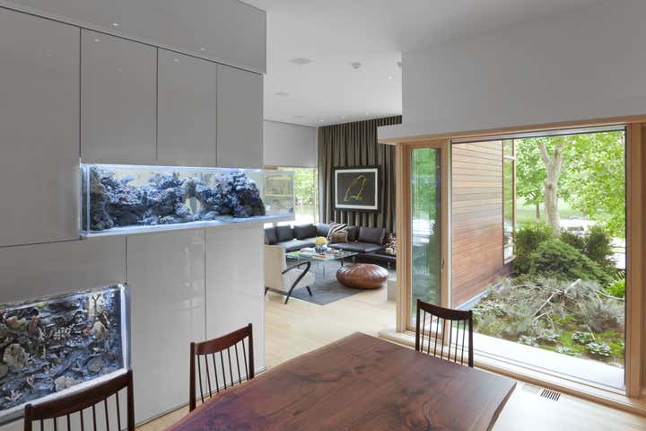 The design of this single family home creates dynamic spatial relationships through overlapping materials and the layering of interior and exterior spaces. Fine articulation and craft of a simple yet rich palette compose restrained minimal spaces that emphasize the family’s activities, artwork, and extensive fish collection in large, integrated aquariums.