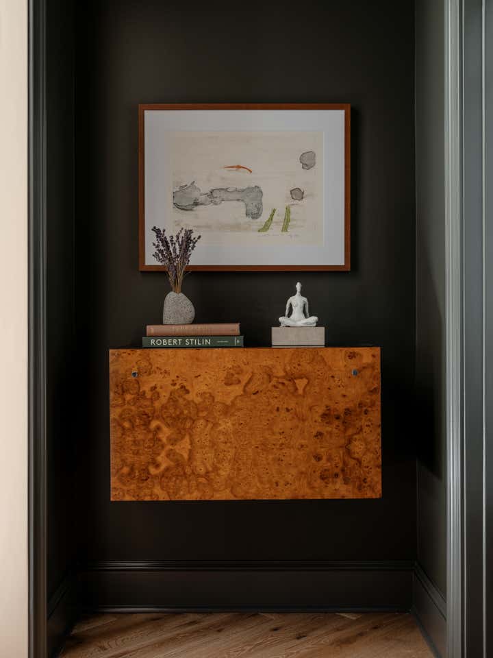 Our clients, former New Yorkers, purchased a new build in a quiet, leafy D.C. neighborhood that was in desperate need of architectural interest, soul, and personality. We embraced the blank canvas as an opportunity to create original solutions oriented to our clients—becoming some of our (and their) favorite moments in the space. Quiet palettes in the main common areas let the art and furniture shine (i.e. dark cabinets in the kitchen, gallery-like white walls in the living room) and deconstructed furniture with a sculptural, minimalist bend provide personality.