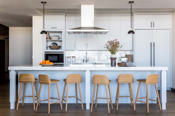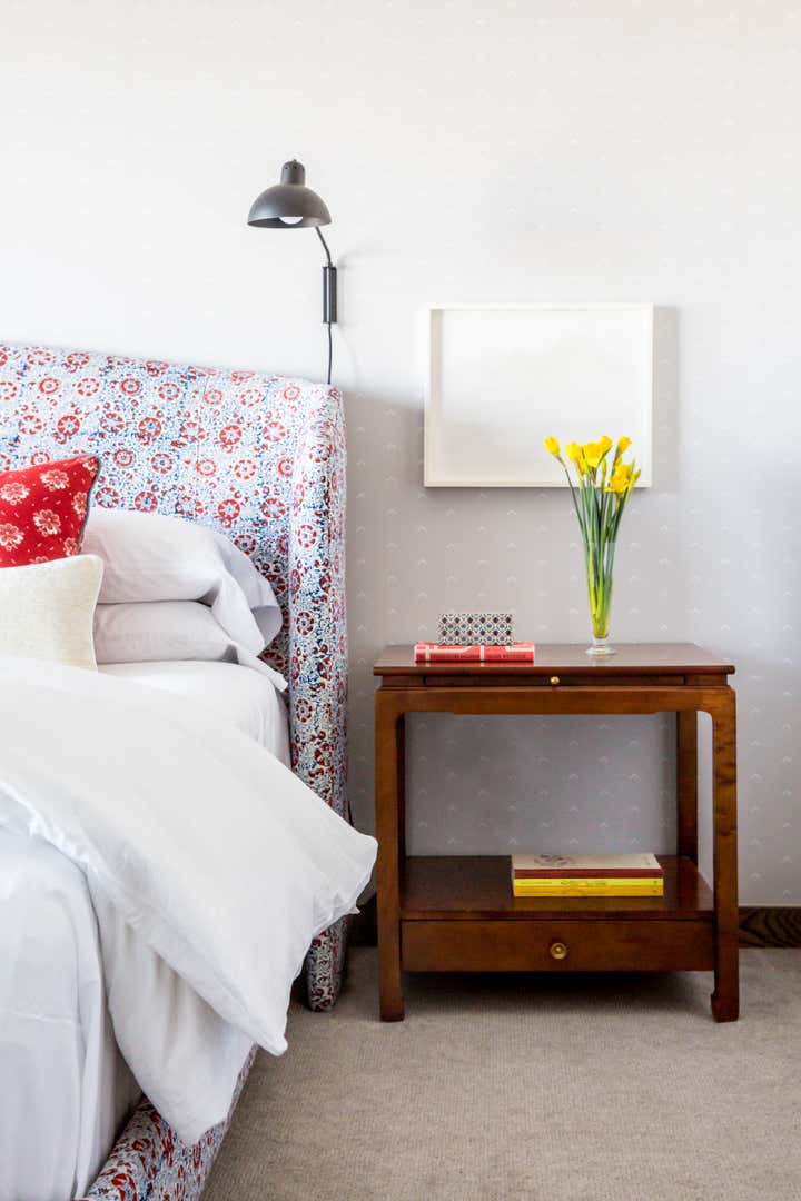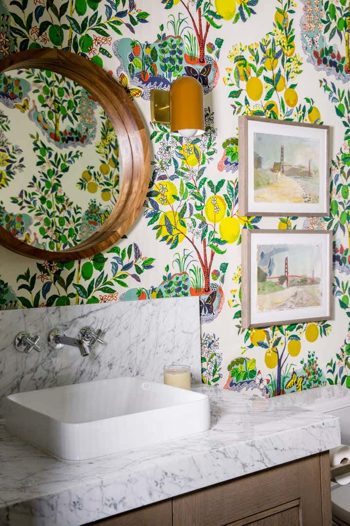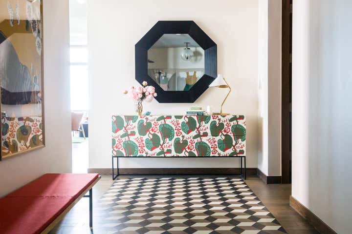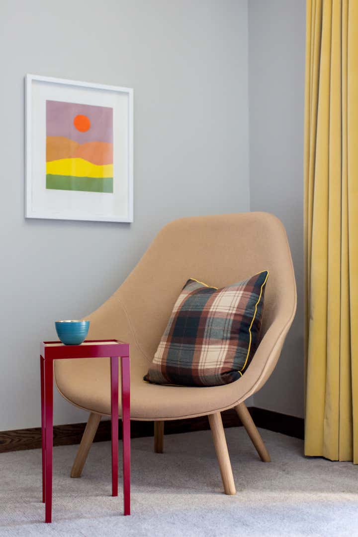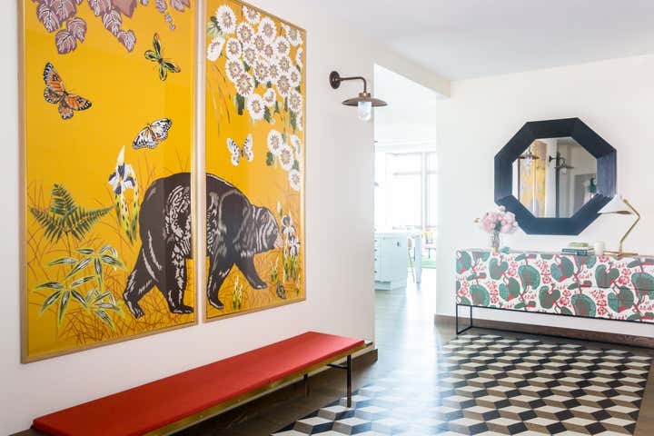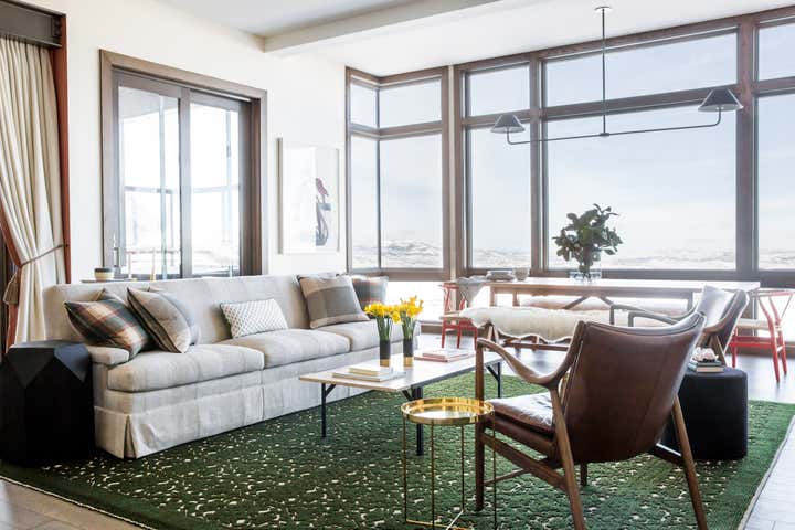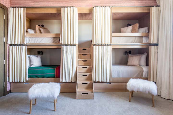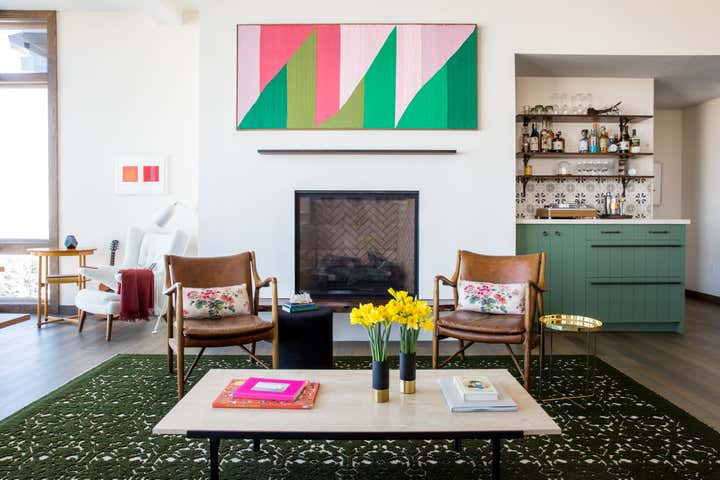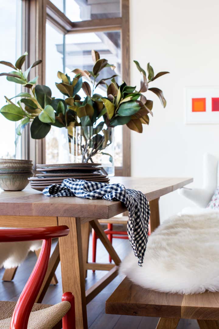 We looked to the Alps for inspiration for this mountain home, and settled on a story of Heidi (the Swiss children’s book character), who grows up to become an art student, and then travels to the American Rockies on her year abroad. Vegetal colors, Josef Frank patterns, embroidery and plaids all shine and bring life to the contemporary clean architecture of the building. A highlight for us is the vintage dirndls belonging to the owner’s mother that we had framed in lucite and hang in the hallway.