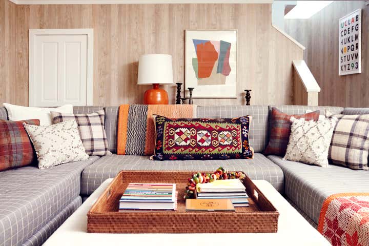 For this classic home on a private drive in Pasadena we redesigned kitchen and baths as well as a downstairs family and game room, bringing the house up to date and simplifying the space plan to serve a busy young family. The color palette is mostly quiet – gray-blues and browns in the living room, gray cabinetry in the kitchen, neutrals accented with pops of color in the family spaces. Shaker cabinetry and classic pieces, like a Chesterfield sofa in the living room and wicker chairs around the kitchen table, mix with more modern touches, like an offbeat living room furniture plan and a custom, u-shaped sectional made for TV watching.