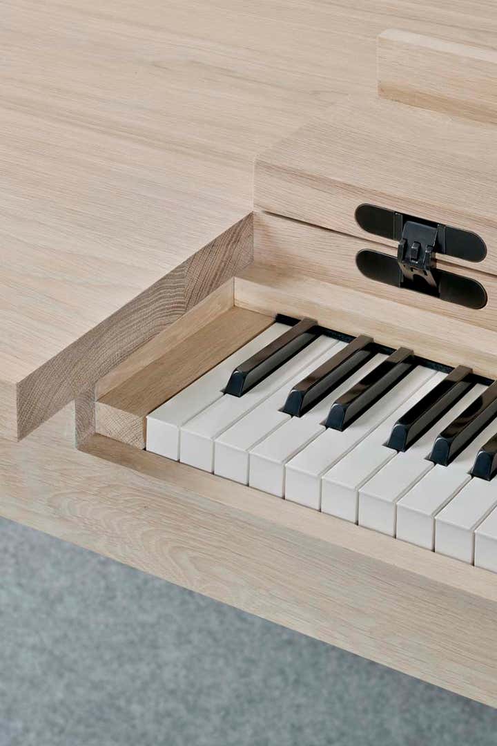 The Piano Table offers the possibility of dining with the accompaniment of a piano. A piano player takes a seat at the dining table. Furthermore, as the occasion demands it, a little band can strike up at the table. The piano player will find companionship by a singer and his microphone and a guitar player. If the cap of the piano remains closed, the plain wooden surface serves as a table without cease. The design of the table can be adapted to the respective spatial situation -