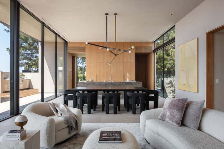 Located in the Trousdale Estates neighborhood of Beverly Hills, the structure was organized around a two-story atrium and takes advantage of views east to downtown Los Angeles and west to the Pacific Ocean. Furnishings were selected to compliment the timeless finish materials of teak, travertine, board-formed concrete, steel and glass.