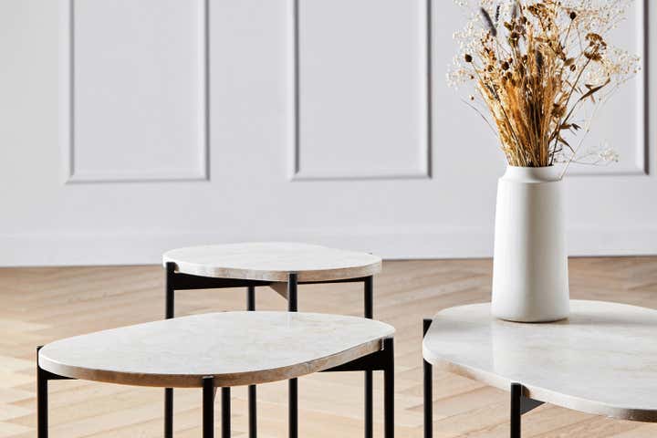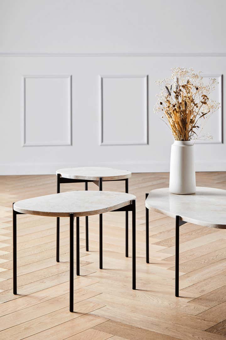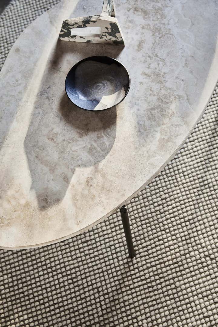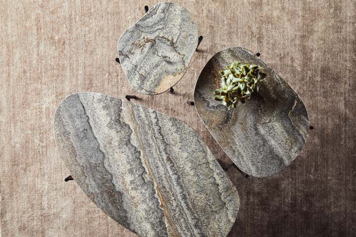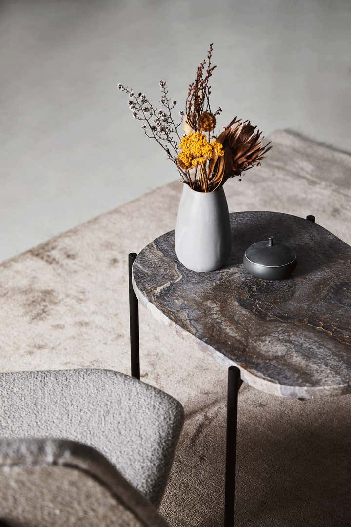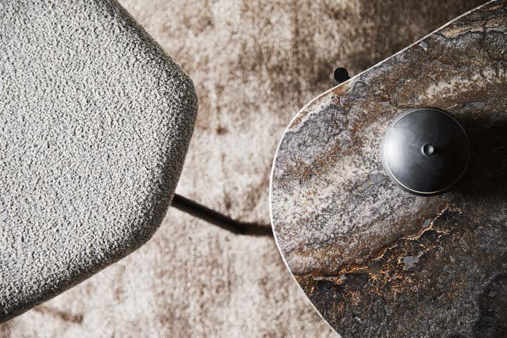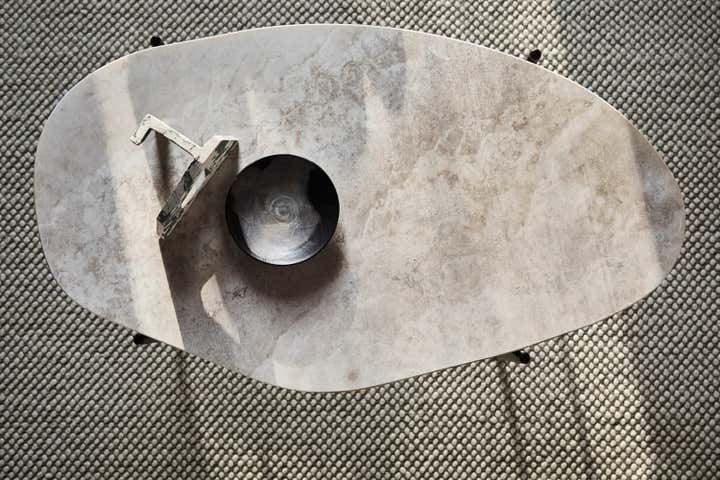 These side tables in three different free forms, different sizes and with two different types of travertine as table tops were developed for the Danish manufacturer Woud (Market launch: spring 2021). Through the material* natural stone you get unique character, because no plate is like the other - so you can create unique landscapes with the tables. The tables come in two appearances. The gray-brown travertine conveys an earthy and strong atmosphere while the light stone is light and calm. and calm. The tables look strong both as a single piece and in a group. In addition to private use, entire landscapes can be created here in hotel lobbies, offices, etc. The black table frames in three different heights take a back seat and let the table tops make their appearance. It was particularly important to Agnes Morguet that the natural stone comes from Europe and that the the table frames are also manufactured in Europe.