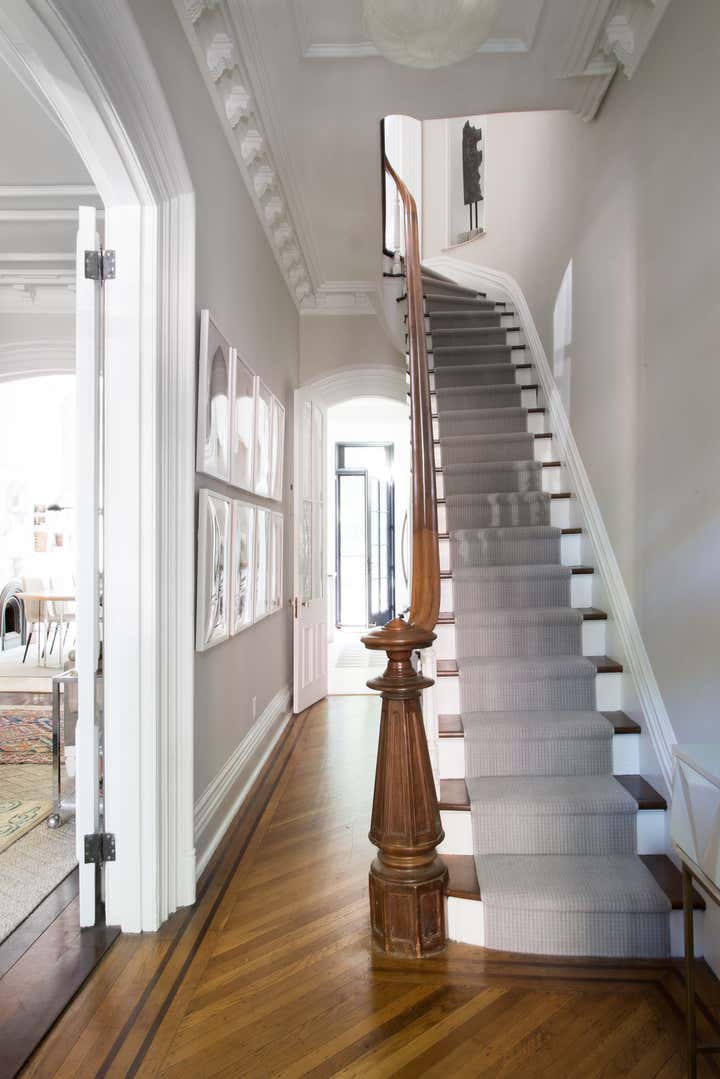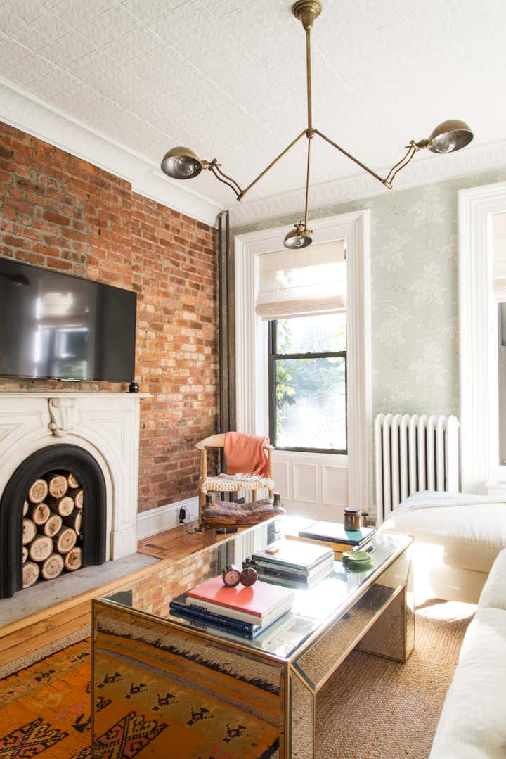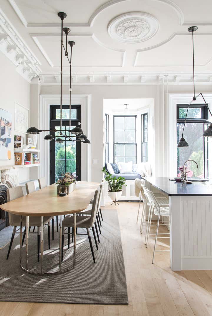 The brownstone, originally built in 1870, was renovated to modernize the amenities and highlight the landmarked building's historic charm. In the kitchen, the center wall was knocked out for a bay window, which invited in light and enhanced the garden and terrace view.