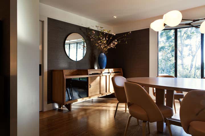 A rambling fifties ranch house within a canyon setting was extensively remodeled in the nineteen eighties, with unfortunate results. In lieu of restoration, which seemed implausible, we opted to keep the Beverly Hills ‘ranch’ vernacular but translate it through modernism. We looked to Eero Saarinen’s 1957 Miller House for cues on incorporating modern details – framing, casework and material combinations – within a postmodern ranch vocabulary. The new interior is highly detailed and precise, with a complex system of posts, beams and brickwork, all painted in many subtle shades and finishes of white, from dead-flat to high-gloss lacquer.