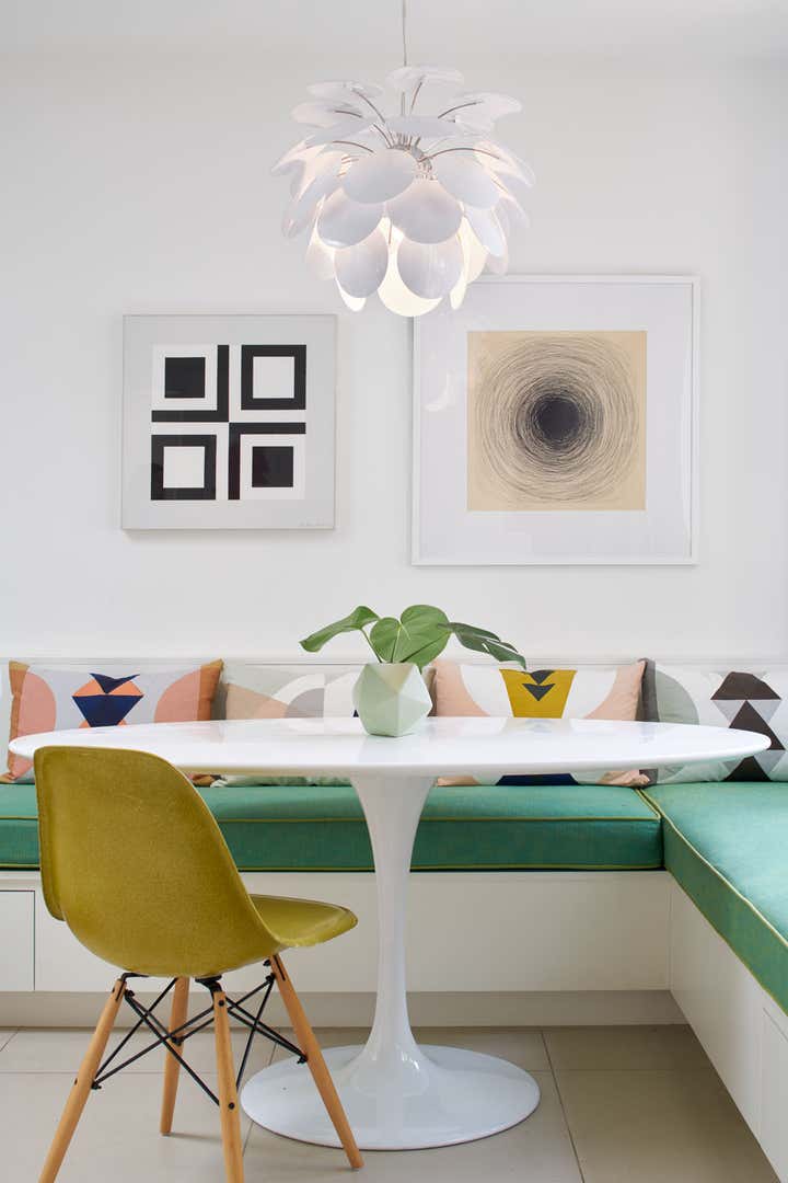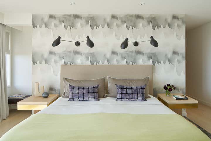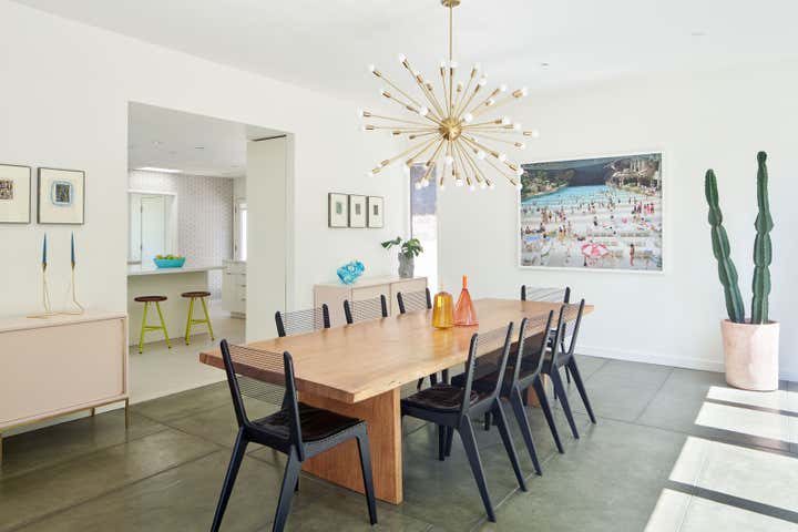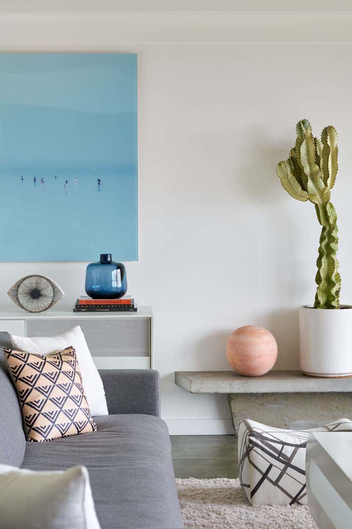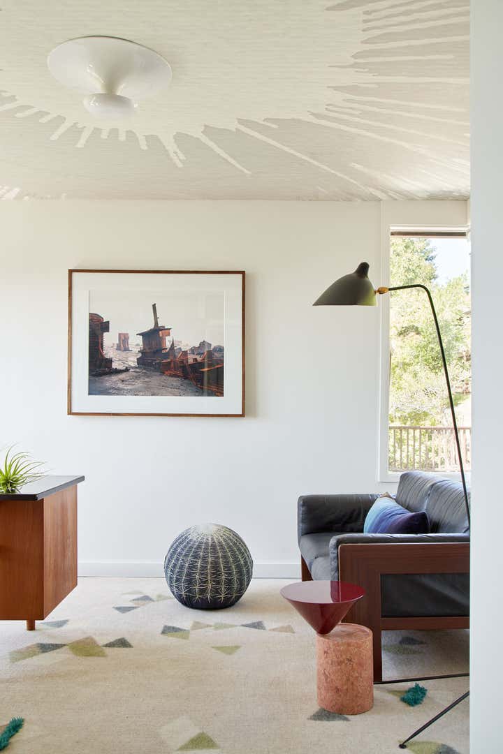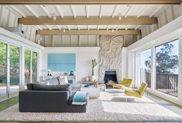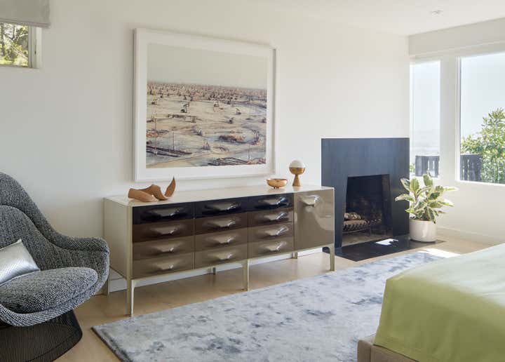 Minimalism meets art-loving funk for East Coast transplants, who wanted vibrant colors, handcrafted housewares, and modern furniture to complement the sparse backdrop of their mid-century Berkeley home. The result is a series of connected spaces that leverage the home’s stunning bay views and original features. Though the work on this project evolved over the course of five years, it never wavered from the original brief—balancing the serene canvas of white walls with punctuated pops of color, texture, and craft. This home’s existing cast concrete fireplace, with its tactile 60’s vibe, offered a strong starting point for the design. The client’s expansive art collection, which ranges from Miro to Cindy Sherman, added visual richness and inspiration. In response, the home became a gallery, and each room was furnished with timeless, but still individual pieces that complemented the art while expressing the client’s personality.