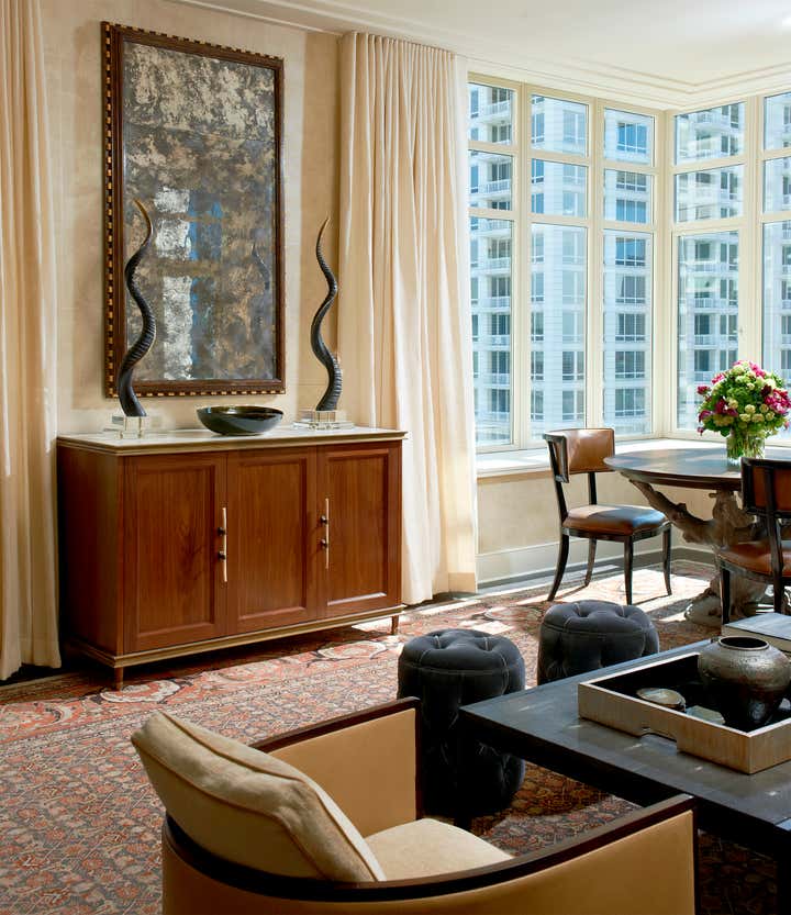 Frank Ponterio’s ultimate goal is to help his clients live exceptionally well. Fine living within a historical landmark is his inspiration for this project. Ponterio presents a masculine, urban space that feels collected rather than decorated, incorporating a sense of modern classic. Taking his lead from the reconstructed Farwell Building, the Chicago-based designer offers his modern translation of a classic 1920/1930’s European interior. Ponterio’s appreciation for the intricacies of fine design and his finesse with preservation and restoration enabled him to celebrate the property’s architectural legacy while avoiding a staid or stuffy tone. Handsome and neat with clean lines and surprising touches like cashmere walls, the space marries elegance with ease. The private and public spaces are graciously balanced, allowing for relaxed entertaining and private sanctuary.