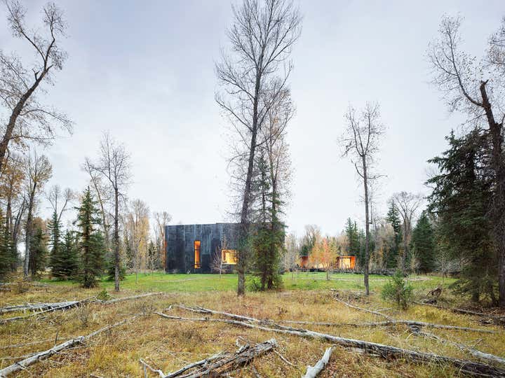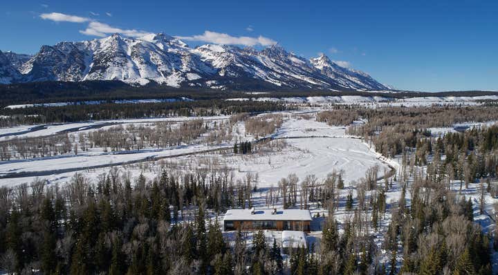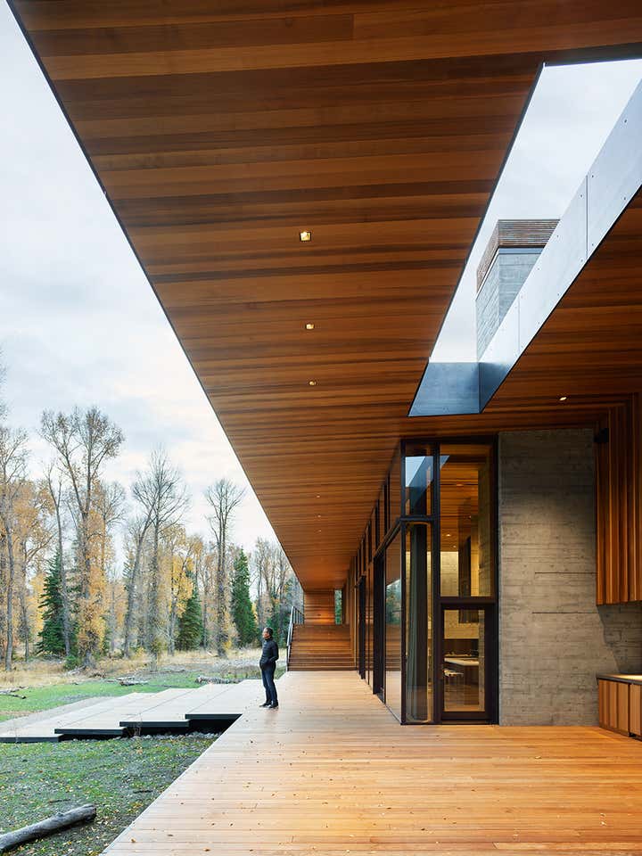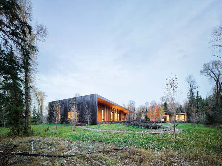 Riverbend is located on the east bank of the Snake River adjacent to Grand Teton National Park. The river forms the north and west perimeter of an 18-acre wooded property that features dramatic mountain views to the north through a veil of cottonwood trees. A careful study of the relationship between the building envelope, river, and mountain views beyond led the architects to elevate the main floor of the house six feet above the natural ground plane. The result is architecture that engages with its riverine and mountain setting.