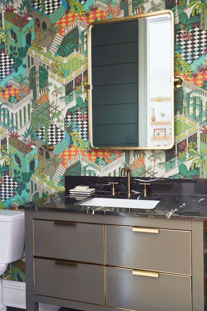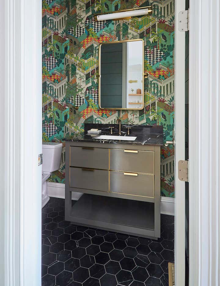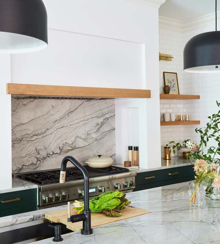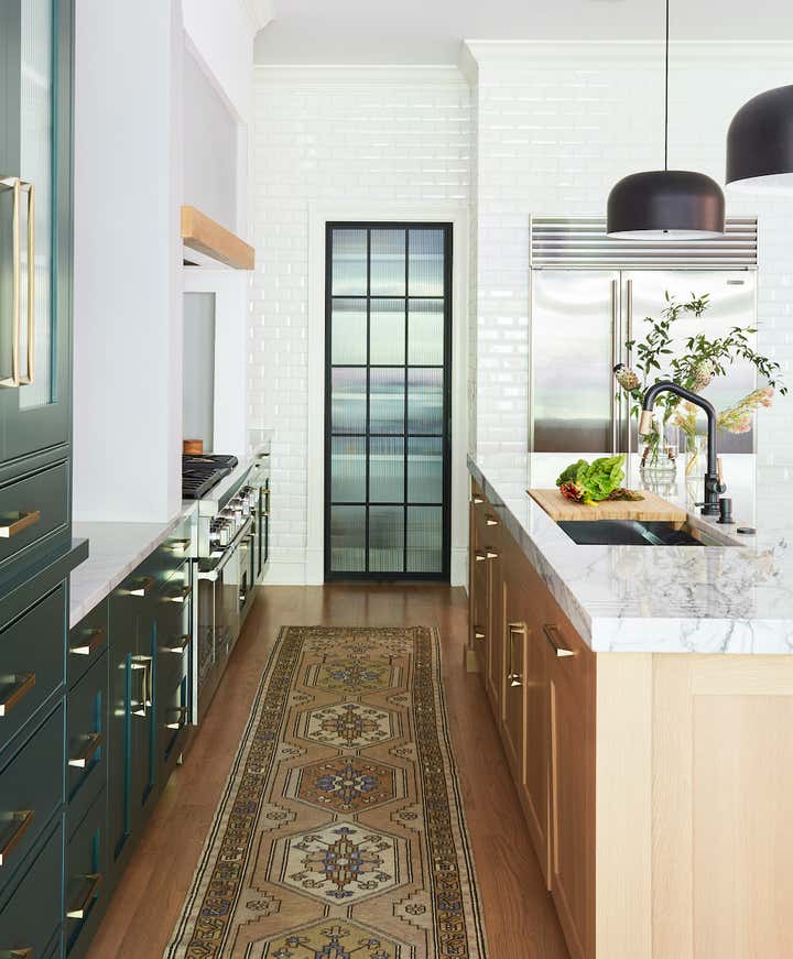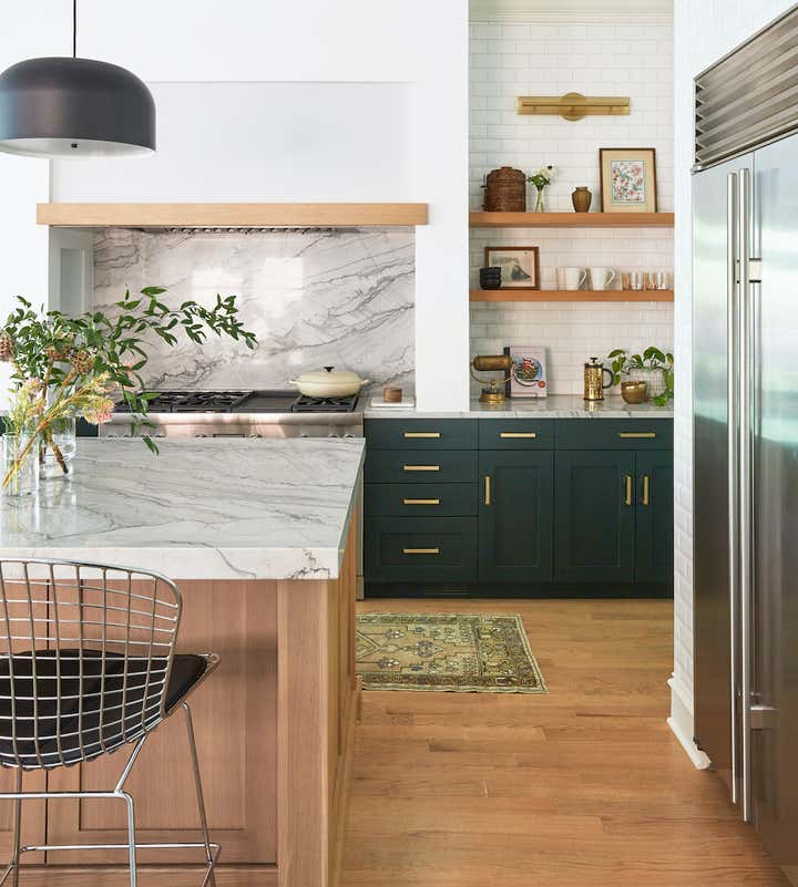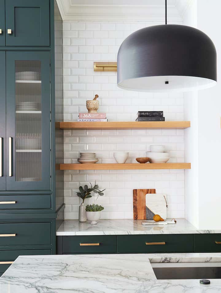 KitchenLab designer Kat Andrejevic headed up the project. The design team wanted to add color while still keeping the kitchen feeling light and open, so they chose light oak on the island and designed open shelves over the wall cabinets. There was plenty of storage with the large island, tall pantry cabinet, and walk-in pantry to skip the wall cabinets all together. A beveled subway tile completes the space and adds some dimension. Unlike a lot of the historic restorations in our wheelhouse, this newer build called for some personality. The team is used to clients who are willing to take more risk on bathroom vanity colors etc. The island is massive, but we were able to find a slab big enough to do it in one piece with no seams and still had enough slab for a mitered edge. It took 10 guys to carry it in the house! It was quite the process but so worth it. Custom cabinetry and interior finishes and fixtures provided by KLI.