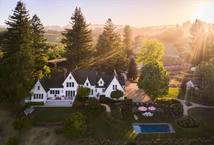 An extraordinary family compound in Sonoma’s Russian River Valley comprises three distinct dwellings for a growing multi-generational clan. Originally three parcels from the actor Fred MacMurray’s sprawling 1941 Sonoma ranch, this 52-acre property now includes an updated 1940s Farm House, an 1865 Gothic Revival Caretaker’s Cottage, and most notably a luxuriously appointed modern Hill House, which overlooks the property’s riverfront beach and 50 acres of estate vineyards.