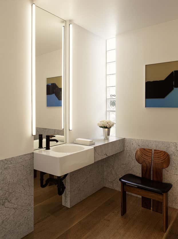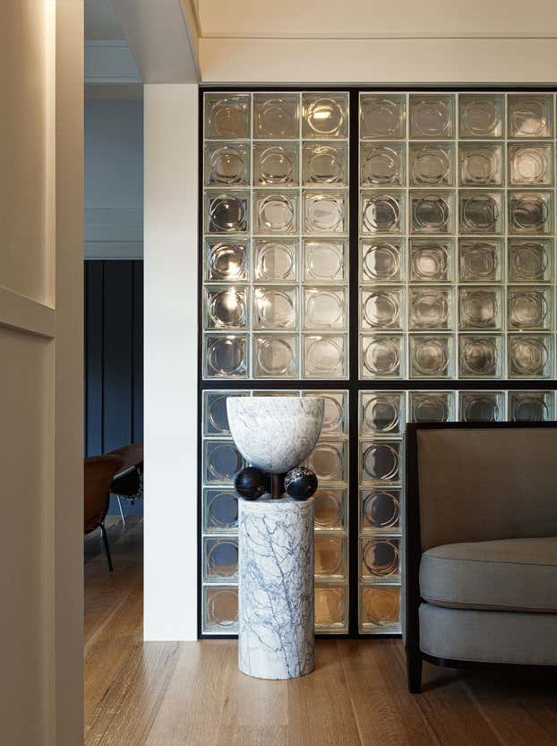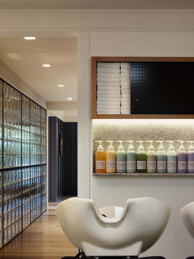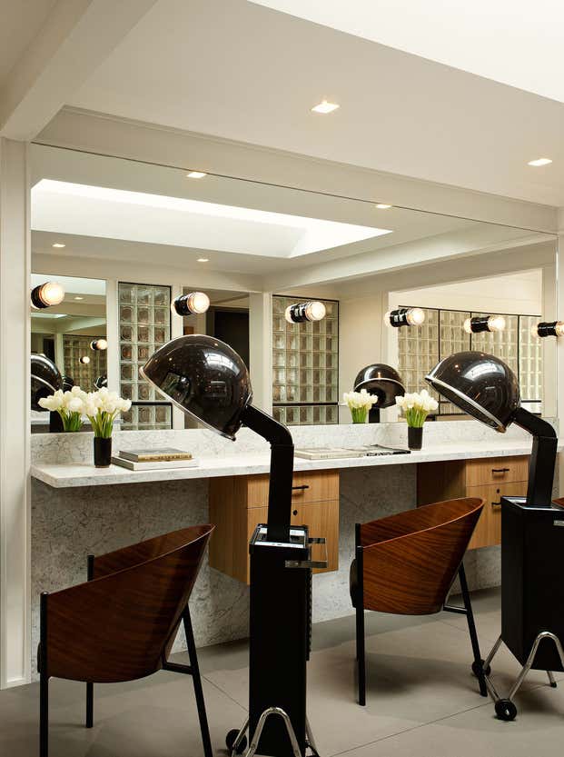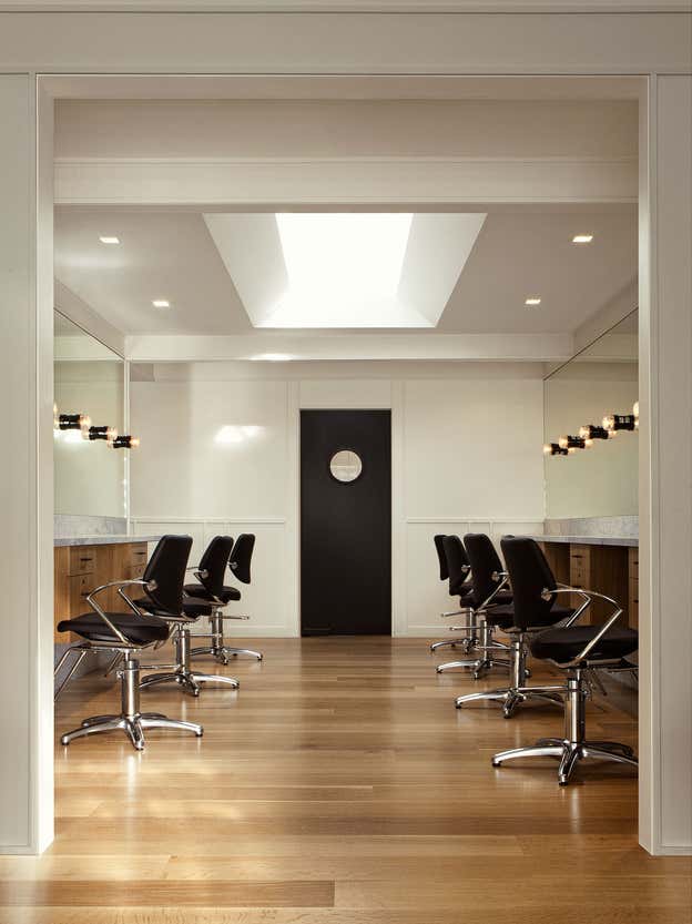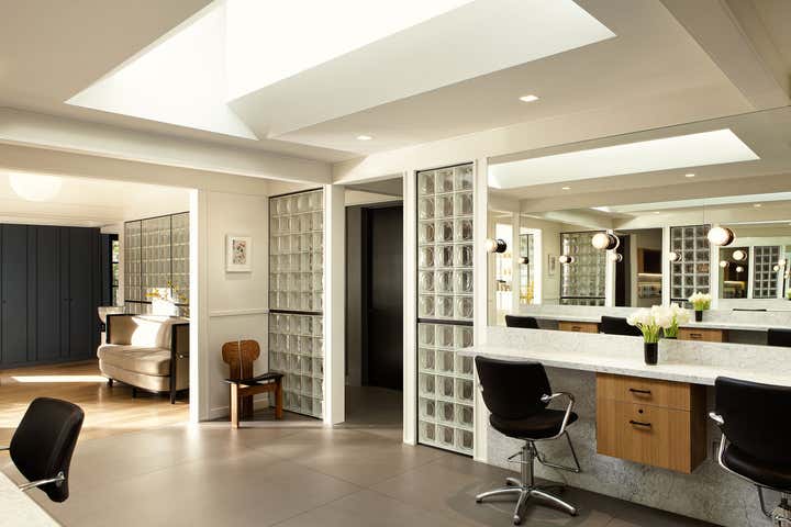 The salon has strong Franco-Japanese influences, with shoji screen-like expanses of Corning glass block that provide privacy and diffused daylight to the reception and waiting areas. New skylights combined with lighting fixtures provide flattering light throughout.