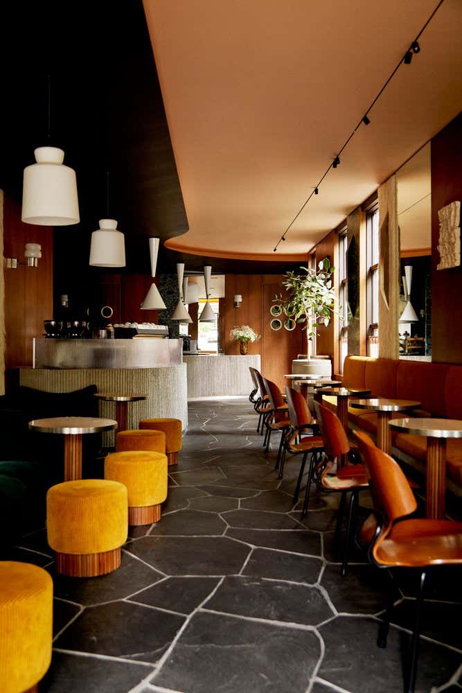 The Cafe design is the result of a balanced tension between brutalist elements and chic and comfortable details. Set aside from the classic chalet look, the design drove inspiration from the Alpine modernism movement mastered by Carlo Mollino, Franco Albini, Charlotte Perriand and Marcel Breuer. The presence of concrete elements like the counter and the bench, or the flagstone floor is counterbalanced by “chic Milanese style” vintage furniture pieces.