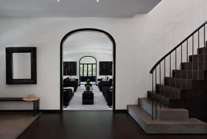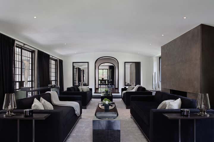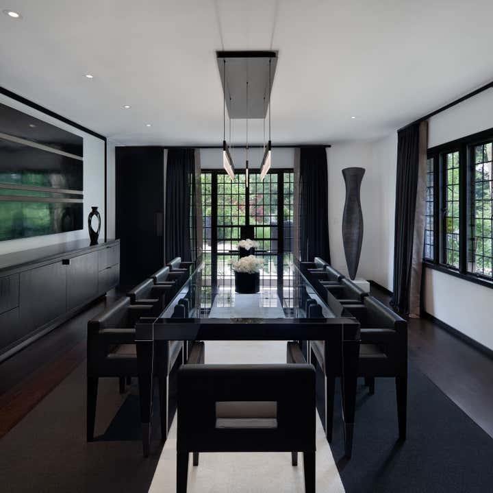 The design reflects the pristine, tailored look that clients asked Jennifer Post to create for their year-round home in Scarsdale, NY for their family. A gracious foyer leads to the formal living room and dining room on both sides of the home. The public rooms are all about being seductive, accomplishing this goal are the color palette of black and smoky gray, silk and cashmere fabrics; and high-gloss ebony floors. The only curves that catch the eye are the rounded arches between rooms, and the larger than life sculptures that stand like sensual exclamation points within the space.
