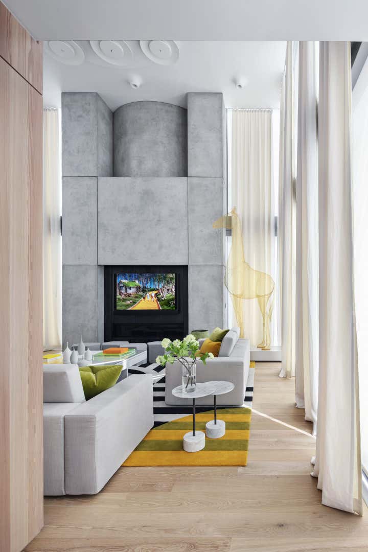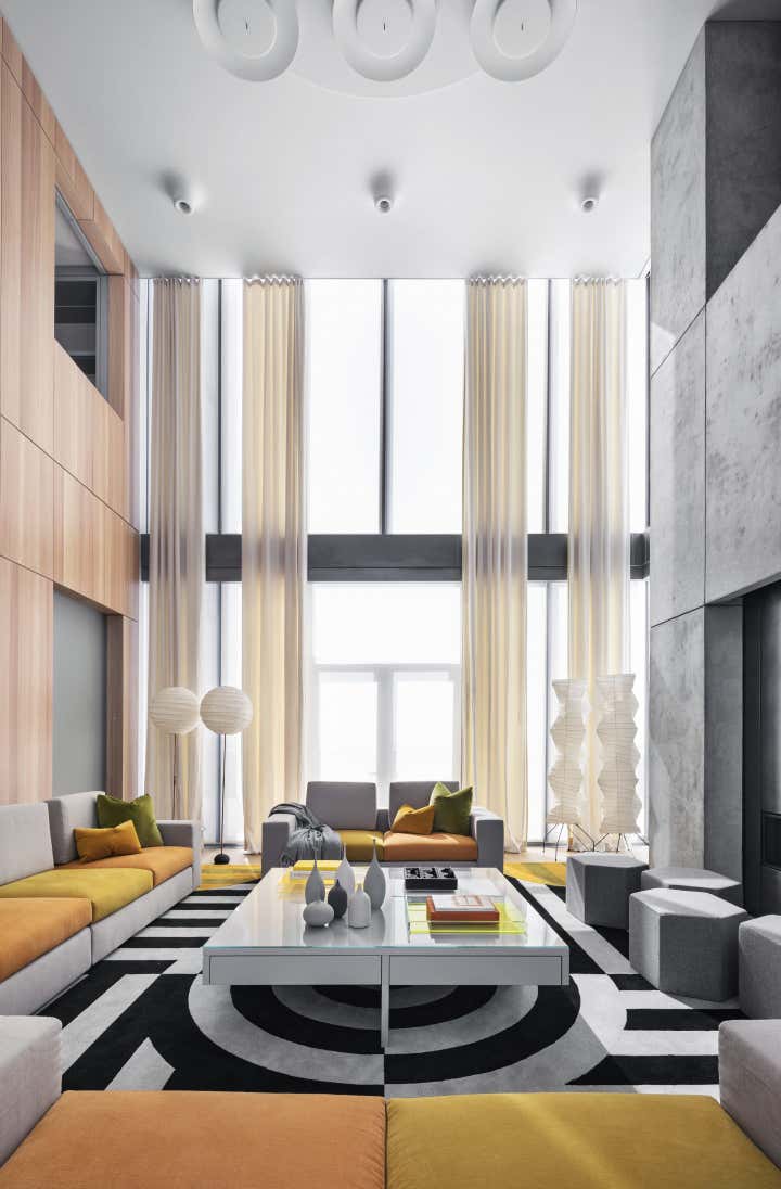 Problem: Combine two disparate developer units atop a new Manhattan highrise, a two-story penthouse and a simplex below, to create a seamless single-family triplex apartment. Solution: Restricted by the existing layout of the combined apartments, the stair provided the only physical link between all three floors. To enhance this physical connection, the materiality and symbolism of a tree – opening to the sky above – is evoked through a three-story screen wall of wooden blocks with varied and enlarging perforations mimicking a leafy canopy providing dappled light. Simultaneously a blue lacquered wall begins as a small feature on the lowest floor growing as it rises to become a prominent element defining spaces, eventually encasing the dressing room on the top floor and framing the master bedroom. Playing off the metaphor of the tree, a warm larch wood with pronounced veining is used to clad the building core containing the fire stairs and elevators. The warmth of the veneer is treated as a skin which is stretched and opened to hold smaller program areas. These areas are treated in a neutral gray lacquer to enforce the reading of the larch as a skin. This skin defines the north wall of the double height living room which is bracketed on the south by a sculptural concrete monolith containing a fireplace and a custom pulley system used to manually operate a media screen. The living room becomes the spatial focal point of the combined apartment, for both its height and its ability to be experienced from many angles. To emphasize this dynamism, the furnishings take on a very graphic quality, sometimes playing back to the tree metaphor by imitating the colors of foliage as well as literally by the use of specific objects. Bold geometric patterns with contrasting colors in the rug and bright colors in the furniture evoke the transparent kinetics of the stair screen chromatically. Sculpture and window treatments further emphasize the unique scale of the space. An orange