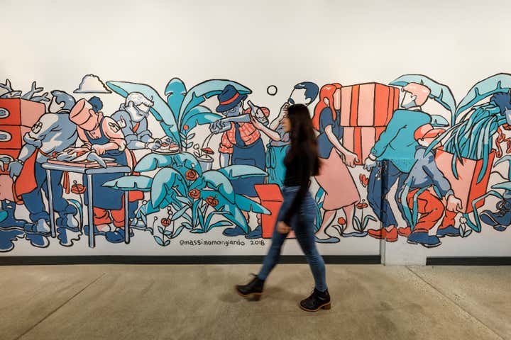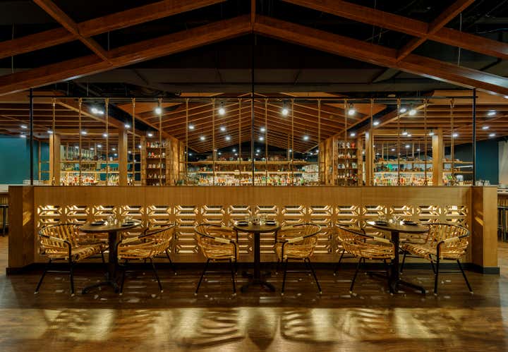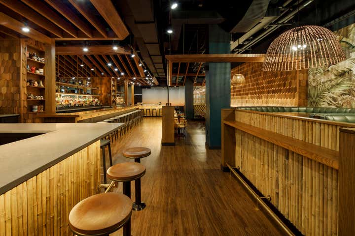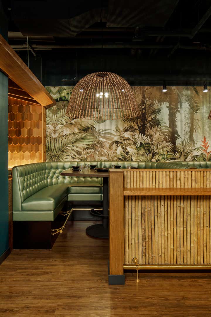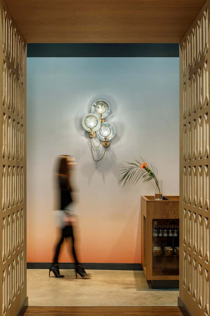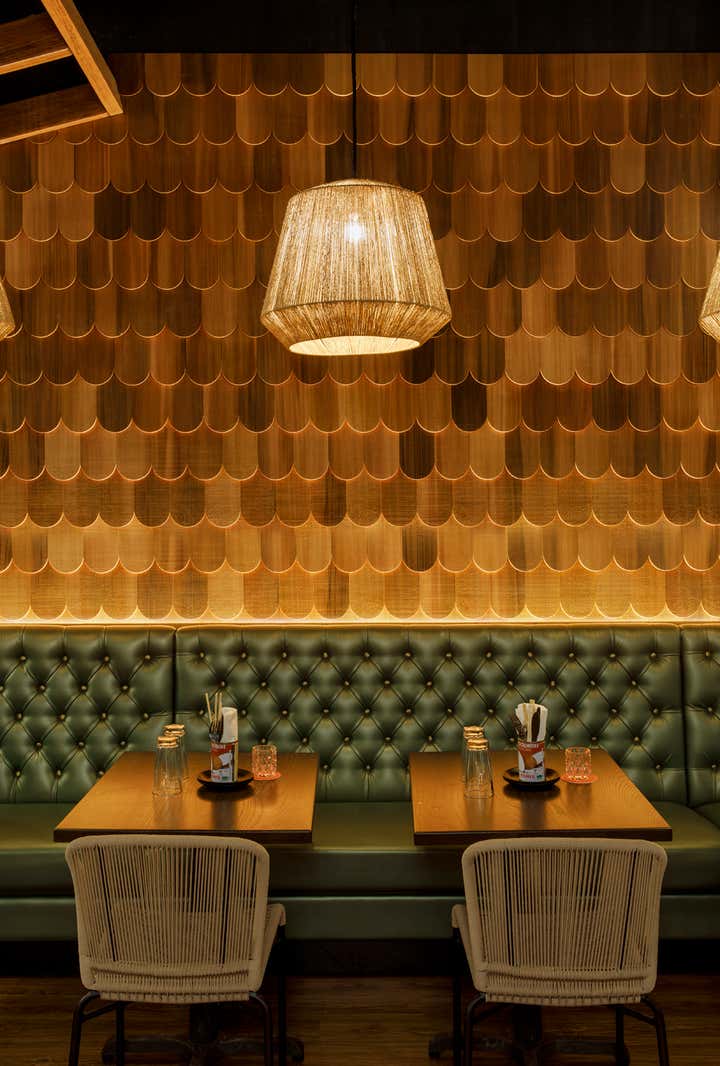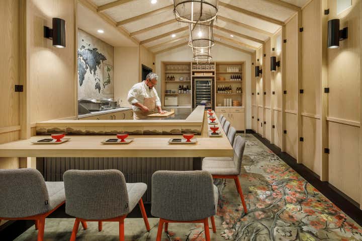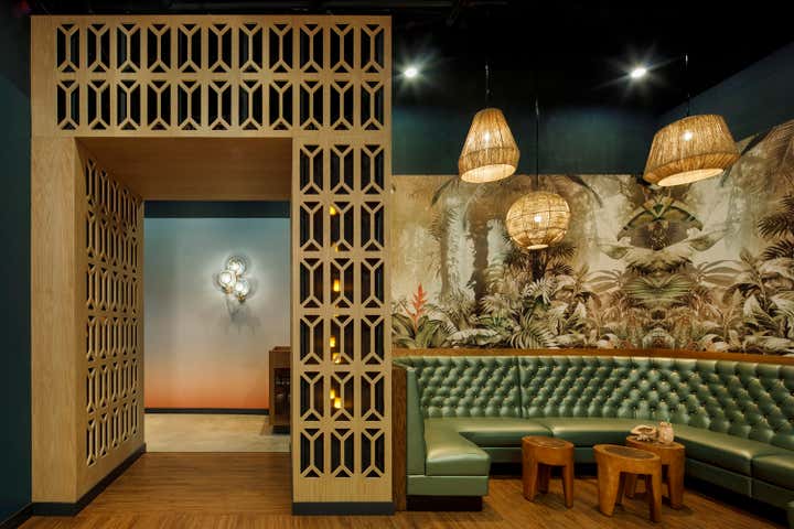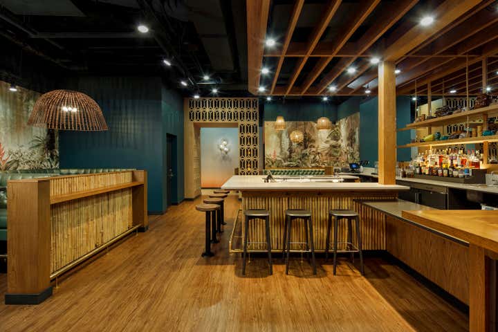 Shore Leave is a tiki bar and restaurant in Boston’s South End. Owned and operated by Traveler Street Hospitality, the ‘subterranean oasis’ is located about 20 feet below street level and serves as a destination for guests to escape and enjoy. The design team drew inspiration from America’s tiki culture, a motif that stretches beyond stone and wooden figures to include a highly considered selection of tropical and mid-century modern elements. This influence was threaded through the space’s design, taking care to be cheeky and not irreverent. The space includes communal booths, private tables, and three bars, seating about 100 guests. At the center, a dining area is partially enclosed by nautical ropes, allowing it to function privately while remaining included in the spirited surroundings. Commissioned art colorizes the space, including a hand-painted mural depicting the owners and management staff by artist Massimo Mongiardo. Head down the back hallway to No Relation, a nine-seat, omakase-style ‘restaurant within a restaurant’ that operates autonomously. Pared down materials, such as light wood walls, a white, Japanese cypress sushi counter, and hand-painted tiles orient focus to the relationship between guest and chef as multi-course meals are prepared and served.