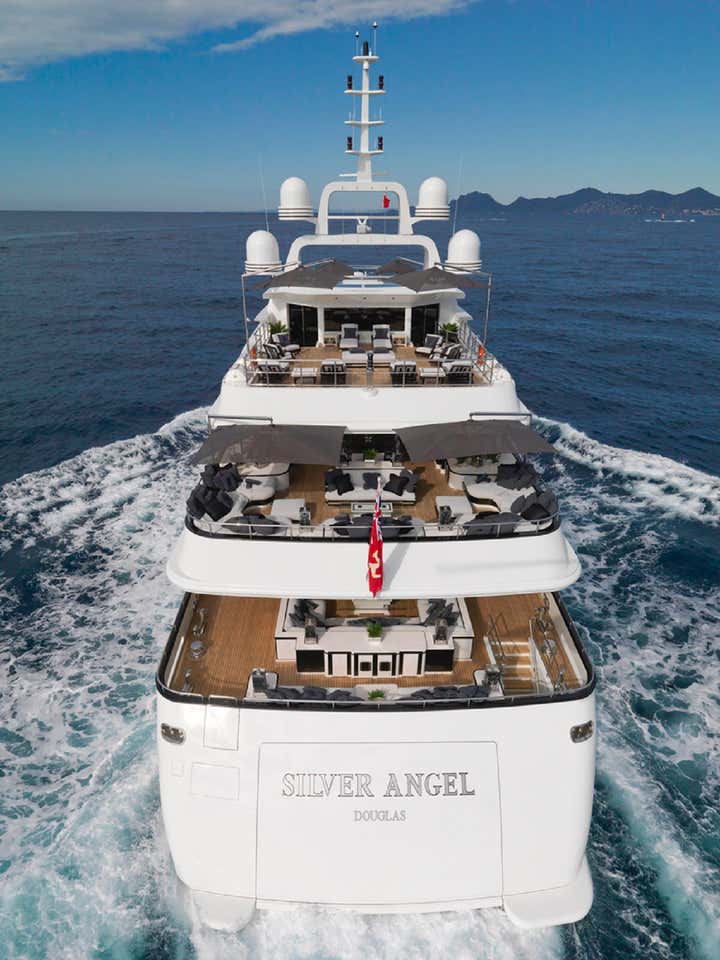 The 65-meter Silver Angel is part of the Benetti FB series, which is the custom built portion of the line, with steel hulls and aluminium superstructures. Long-time Benetti collaborator Stefano Natucci worked on the design under the guidance of Lady Green and Argent. With 10 cabins, including an unbelievable master cabin, Silver Angel has mind-bending accommodation for up to 18 privileged guests. As you cross the threshold of the black-and-white themed main salon, you enter a world unto itself. Not only is nearly every material monochrome, note also the ubiquitous presence of figurines, sculptures, decorative touches and mirrors in Lalique crystal. The mirrors in particular add to the incredible spaciousness and the slightly surreal feeling of being in a palace. The main salon also benefits mightily from a very apparent effort to develop a symmetrical look that would have left the ancient Greeks in a delighted reverie. Much of the furniture is finished in a silvery upholstery that lends itself to the feeling of luxury and is a good accoutrement to the yacht's christening.