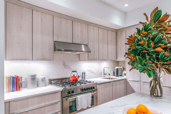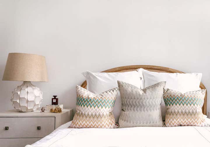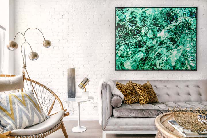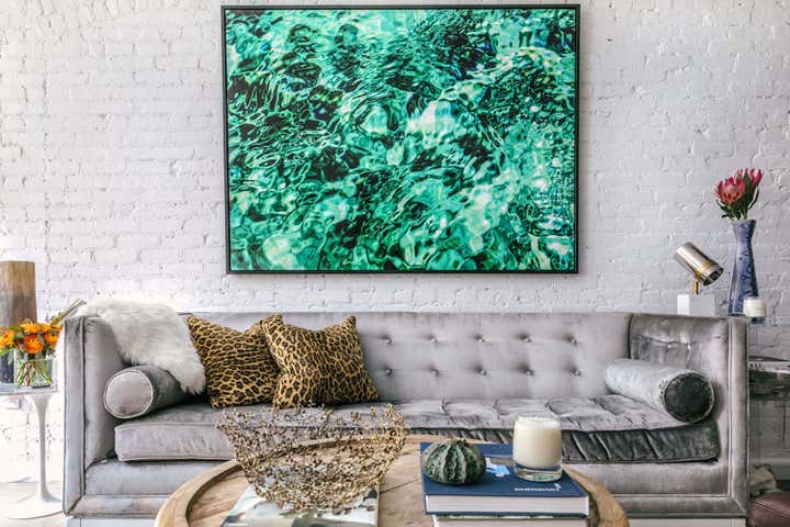 A converted artist's loft complete with exposed white brick and drenched in natural sunlight.