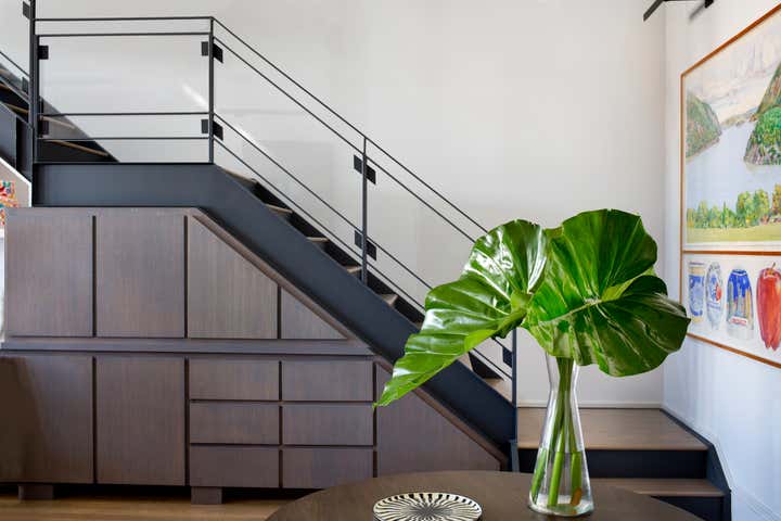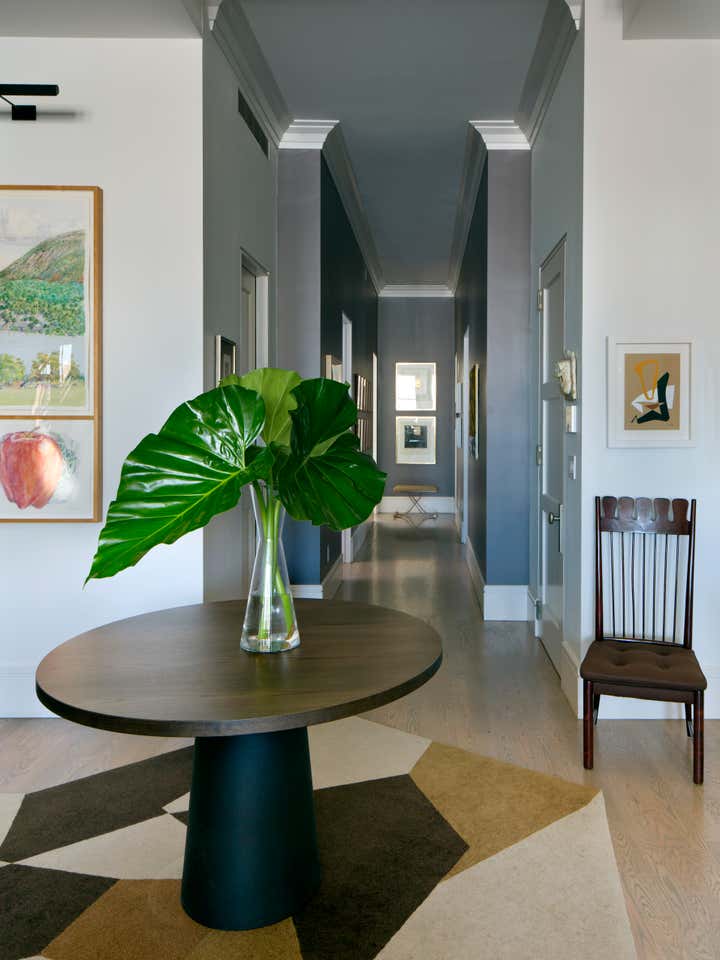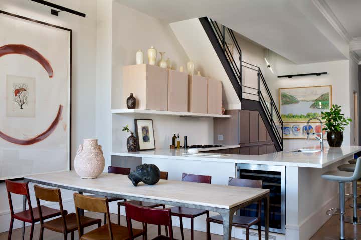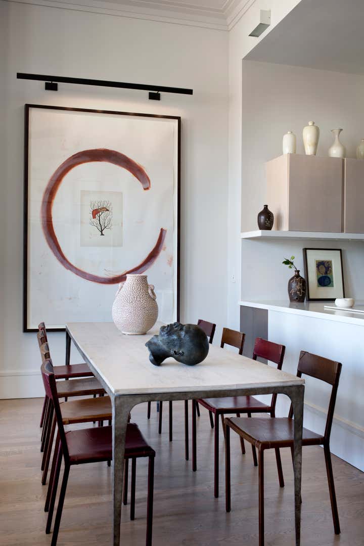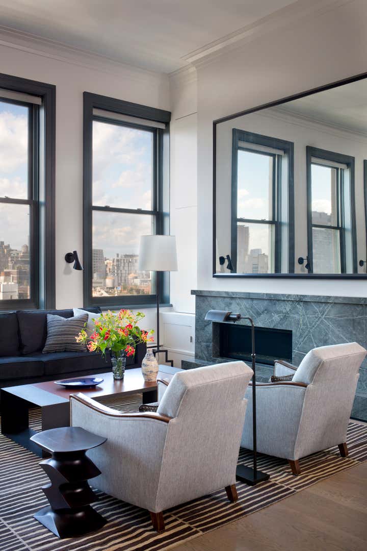 After living for more than a decade on the Upper East Side, these empty nesters headed a few miles south to Soho to try loft living. While some items from their expansive classical pre-war apartment made it to the new address, most everything was selected specifically for this apartment. The expansive very open Living – Dining – Kitchen with 12 foot ceiling and a wall of large windows facing west offering protected views over the landmark district and ever-changing sunset views. To create a living area that suited many functions we created a custom 20-foot L-shaped sofa with one end offering ideal TV viewing, and other end creating a seating group focused on the marble-clad fireplace. To amplify and expand the incredible light and views, we had the largest possible framed mirror made that would fit into the building’s elevator. Custom cabinetry combined with steel shelving house the discretely displayed television, books, and ceramic collection.
