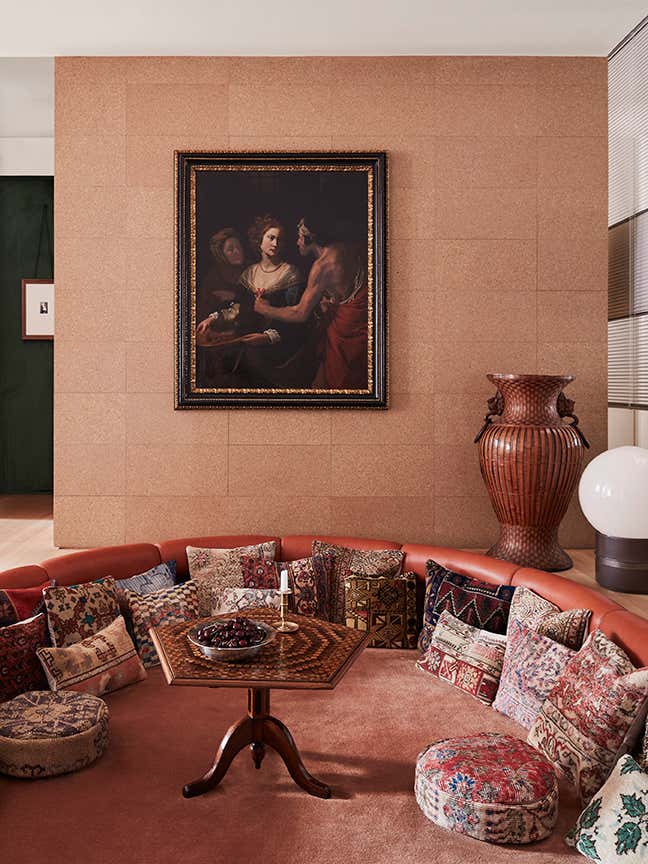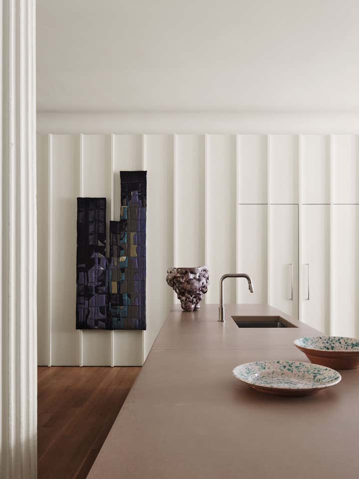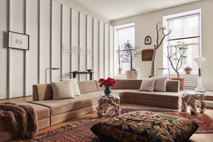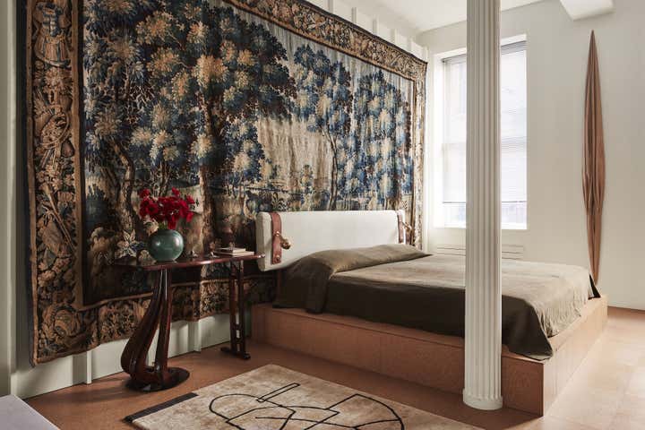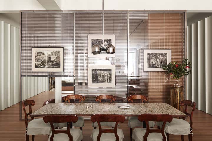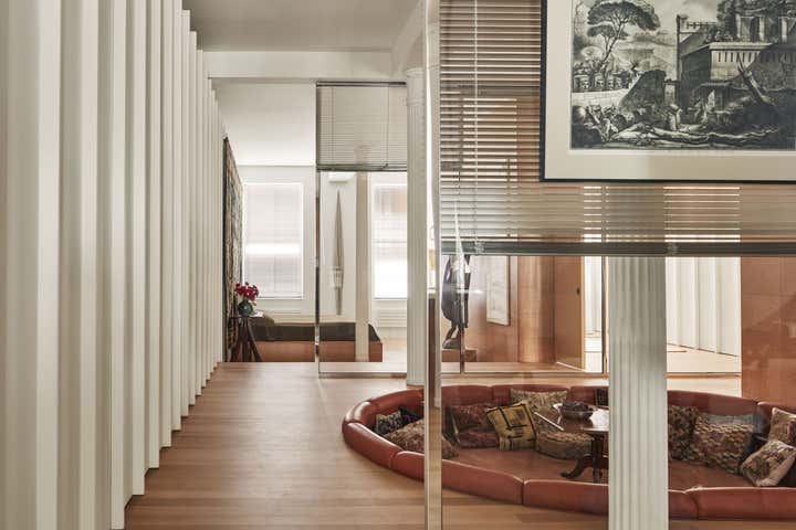 In this Manhattan apartment radically transformed by Charlap Hyman & Herrero and Food Architects, significant pieces from design history create moments where the old and new complement one another through intentional points of tension. Nods to the High Tech design movement and the Biedermeier period, along with countless historical art pieces and custom furnishings, line the corners of the ribbed walled, rectangular space.