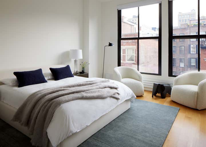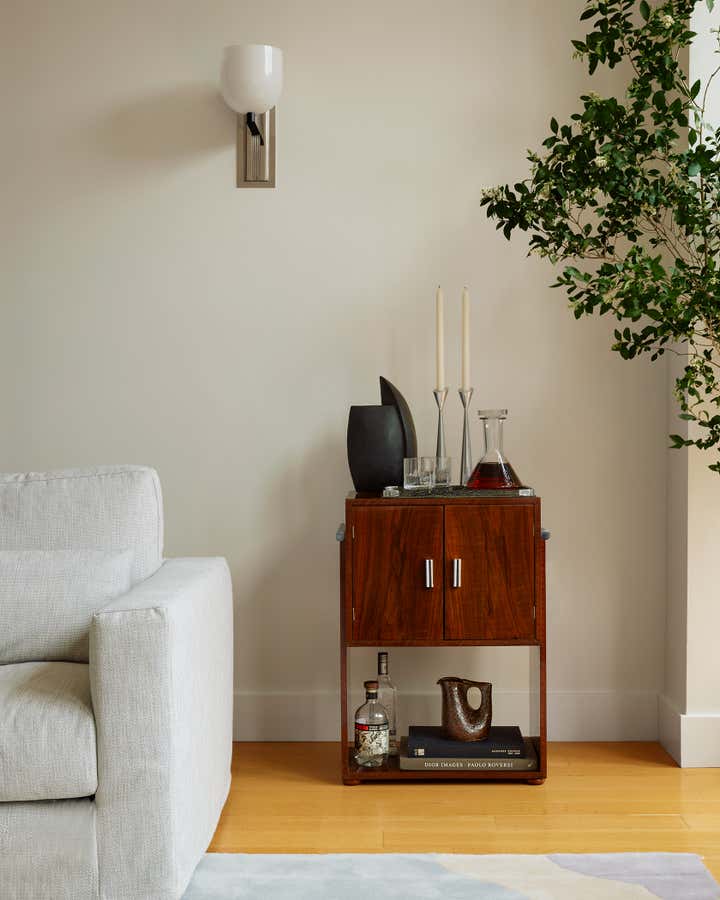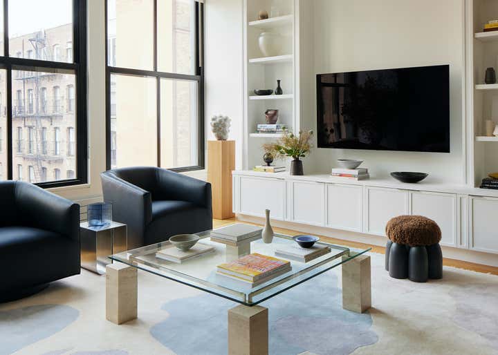 Set among the stylish shops in the heart of Soho, we were tasked with furnishing this spacious two-bedroom residence with comfortable and modern pieces. With floor-to-ceiling windows and ample day light, we kept the color palette muted and focused on strong silhouettes, contemporary aesthetics and mixed in fun vintage finds, like the art deco bar cabinet.