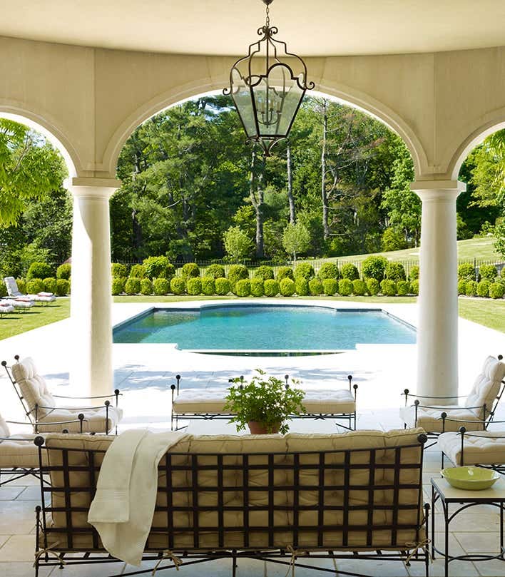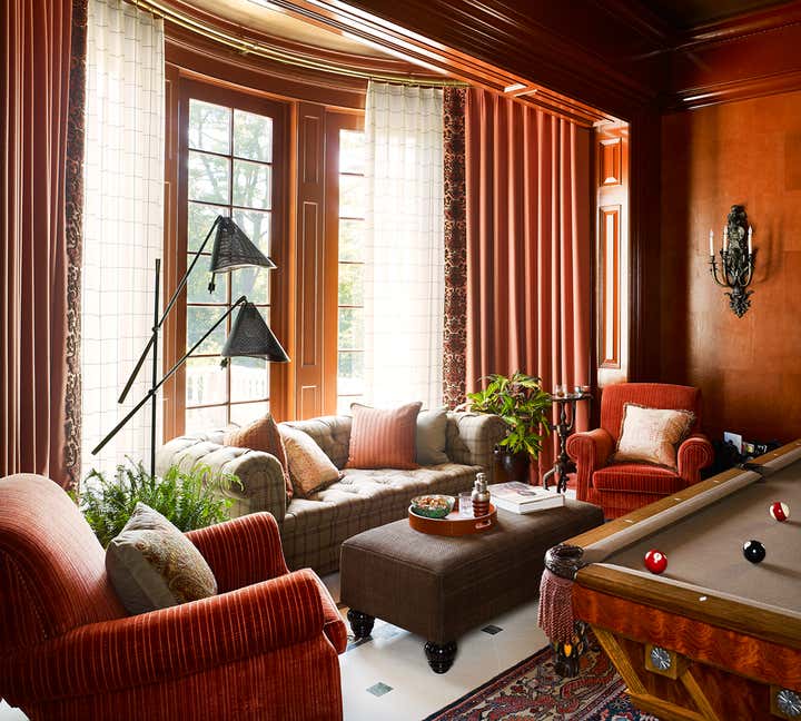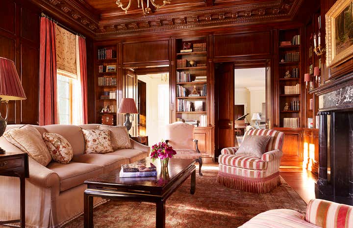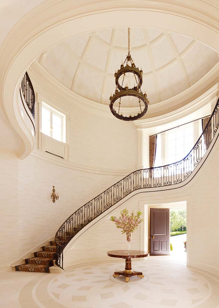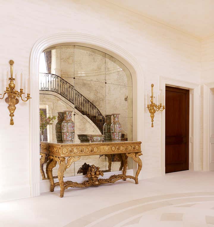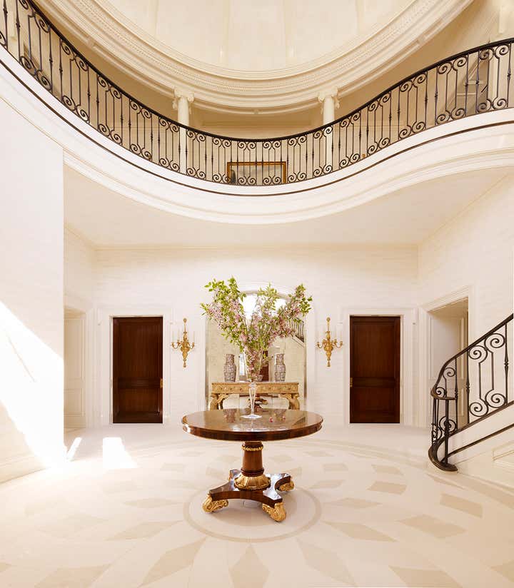 Located in Greenwich, CT, this finely constructed new build features a large foyer with a custom-built wrought-iron staircase, 12’ bronze doors, textured plaster, and Fortuny upholstered walls. The home design of this 18,000 square foot mansion combines elements of luxury living with the practical comforts of family life.