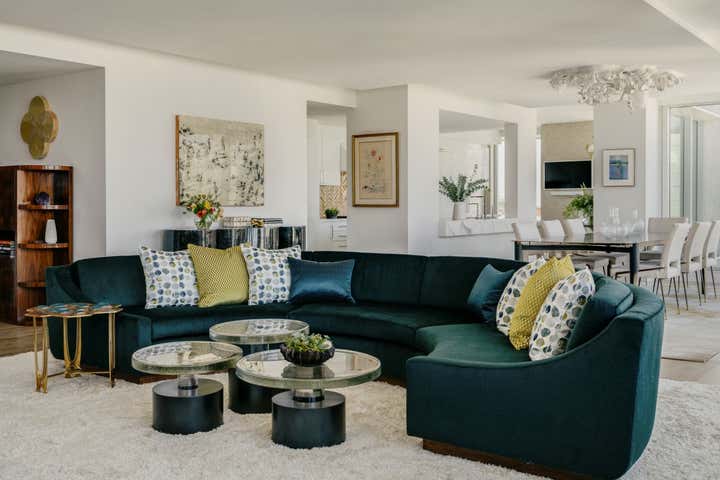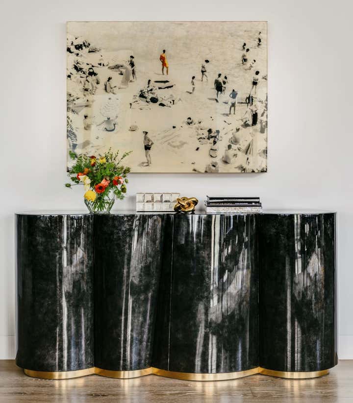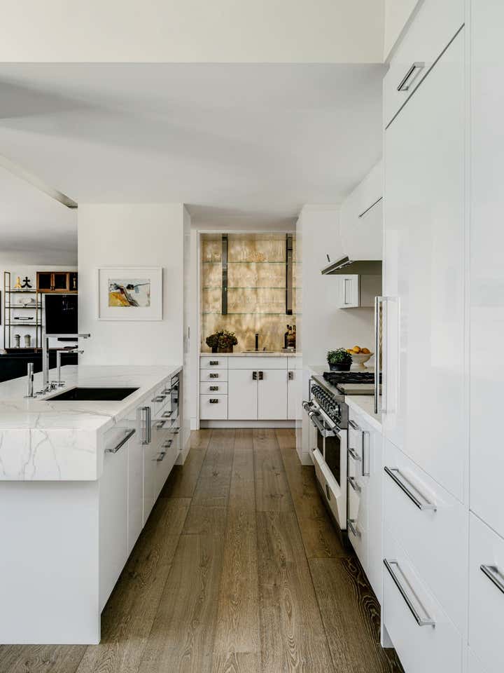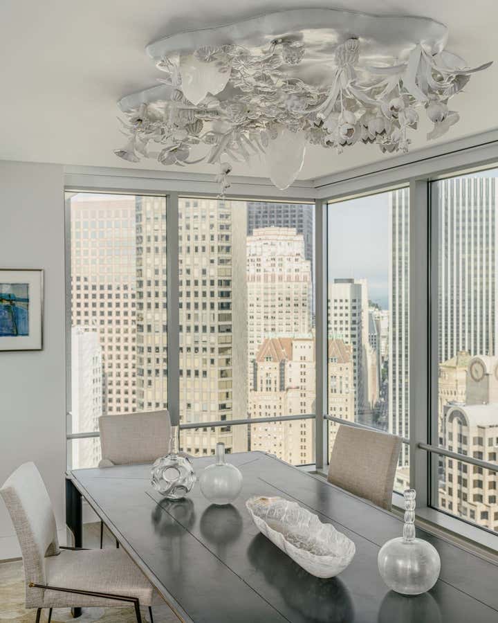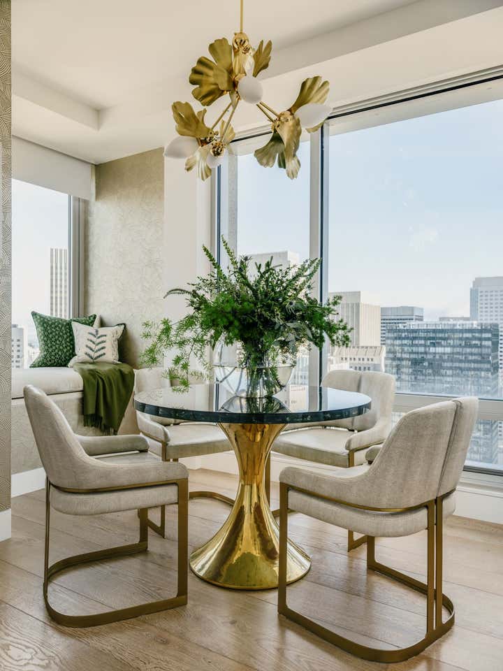 Opening the kitchen and dining room allowed in natural light and made way for the owner’s impressive art collection, a luxe mix of materials like thick marble and onyx, and custom everything from the curved sofa in the living room to the area rugs, wallcoverings, powder room mural and Venetian plaster wall finishes. Even the light fixtures and powder room mirror are special and present more like sculptures mounted on the ceiling or walls. Each piece of furniture is more of a statement piece than the last, and floor-to-ceiling windows afford views of the city that make the biggest statement of all.