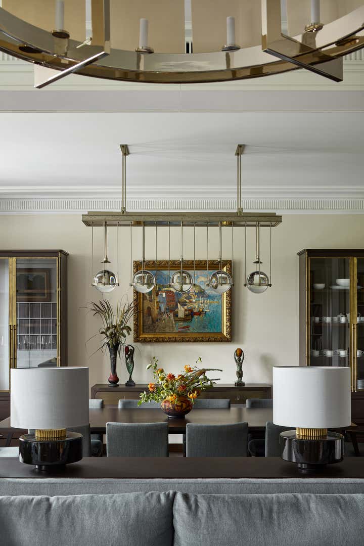 The chandelier above the dining table, from the O&A London Designer Collection, is a light installation rather than a light source. It is the quinta Essentia of the designers’ taste combining historical styles and modern technology. The technical construction of the Avior chandelier became the main element of design.