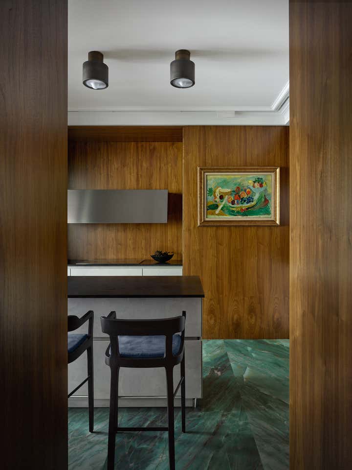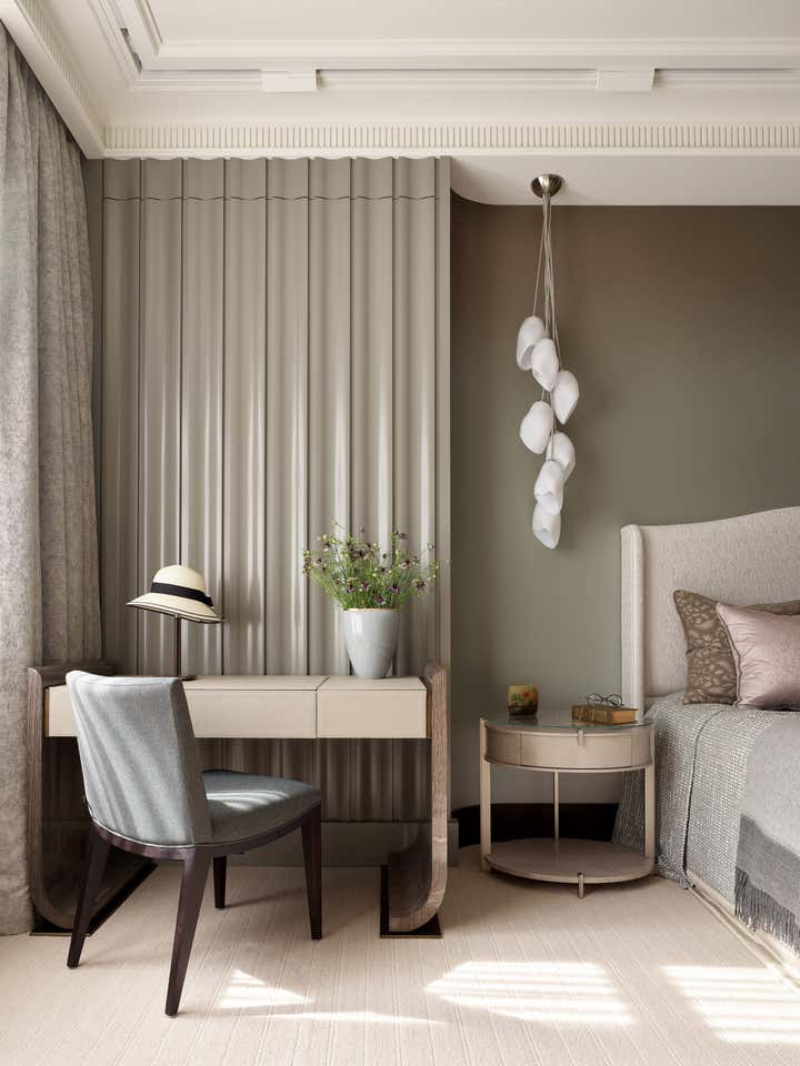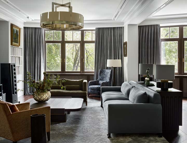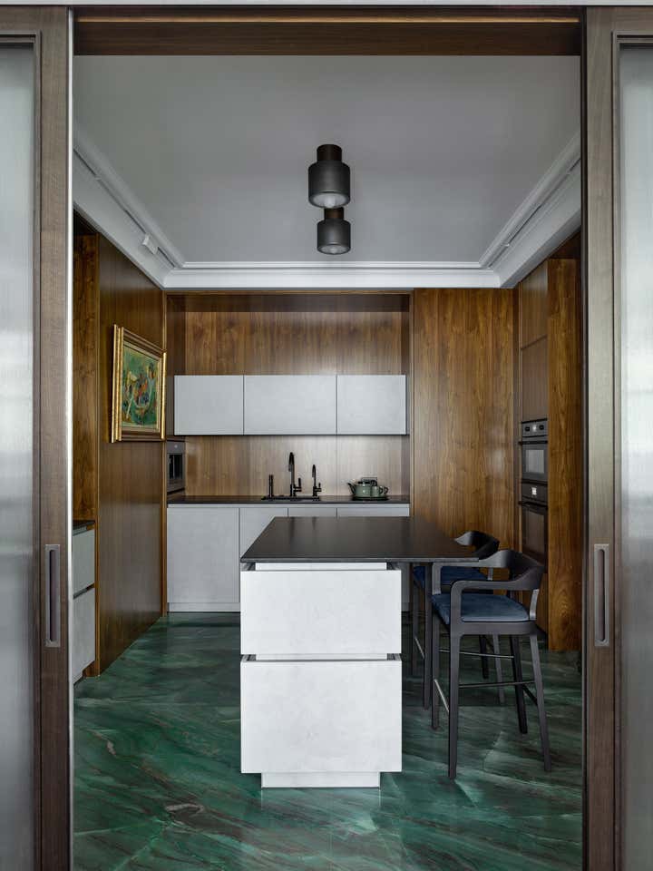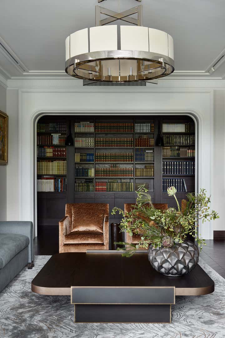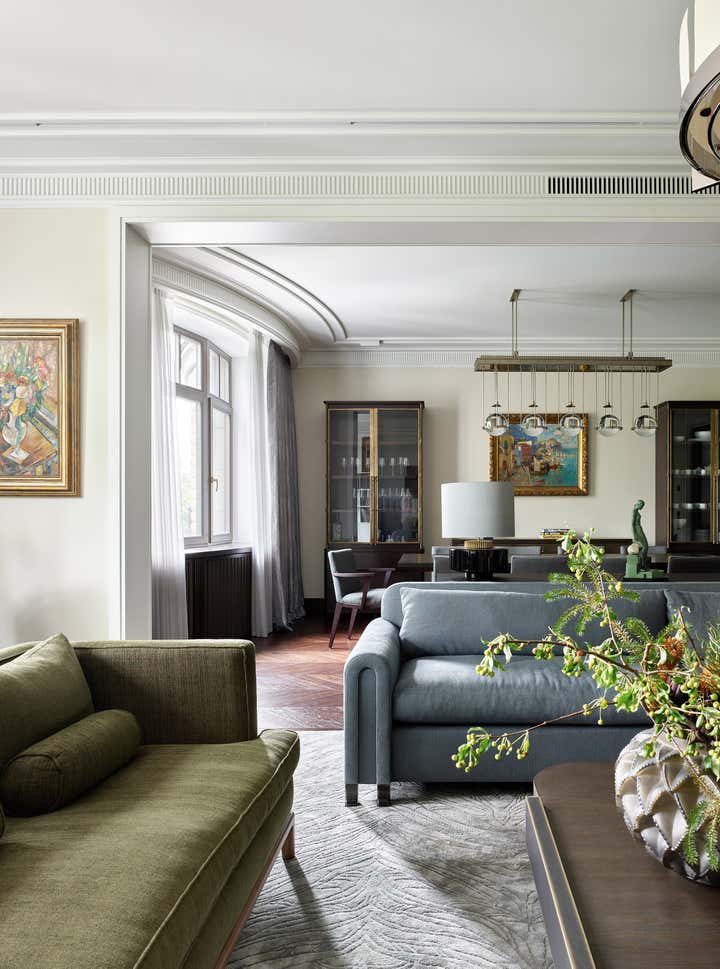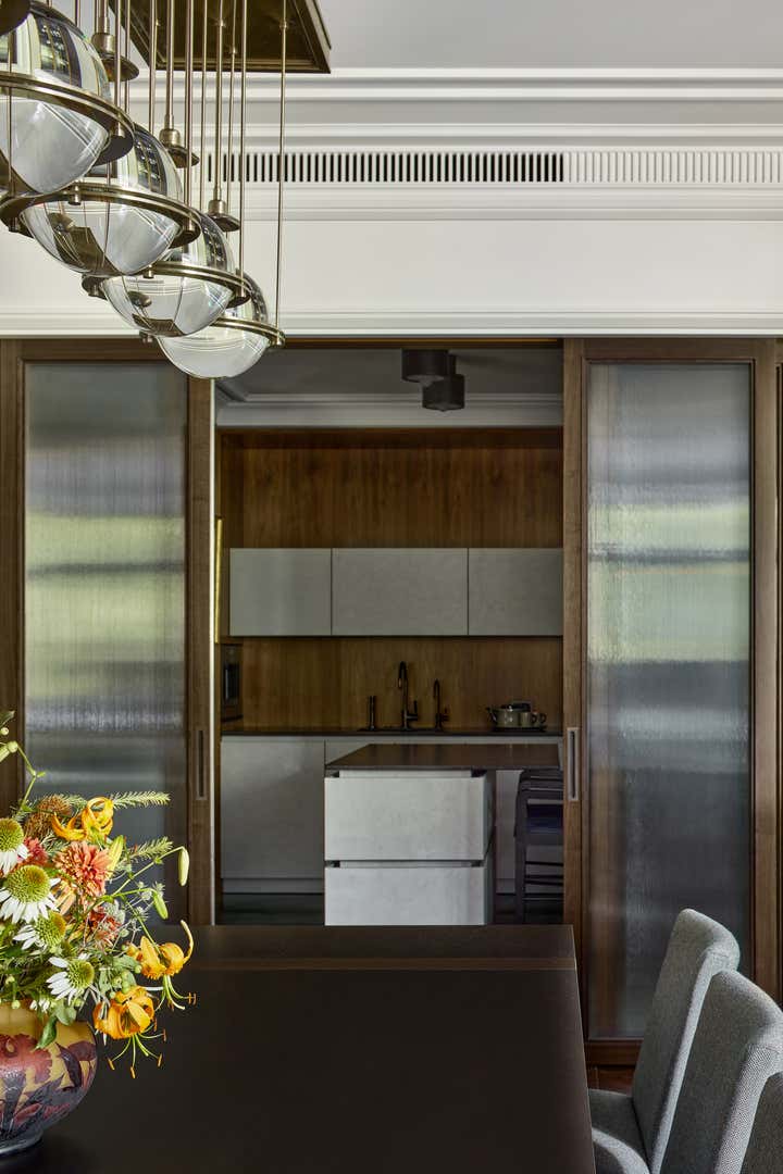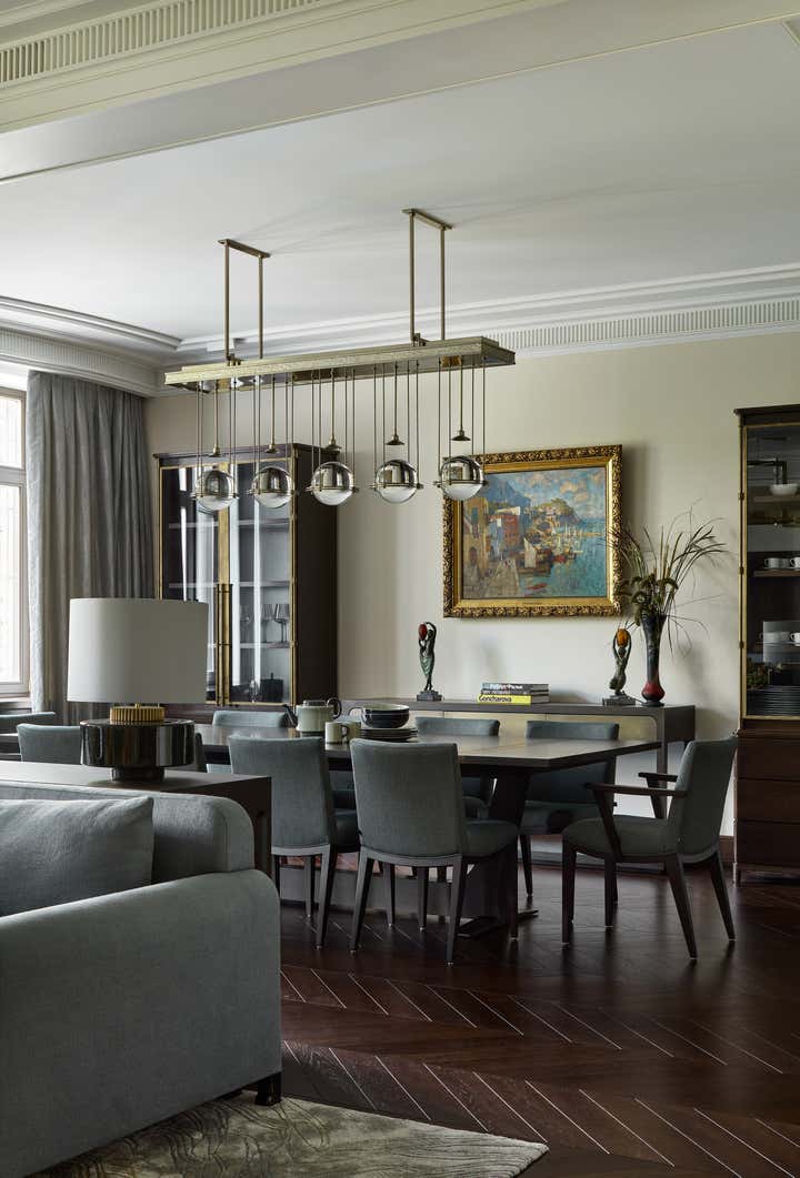Elegant cupboards designed especially for the dining room go perfectly with art objects, giving the impression that they have been in this apartment for a long time. The designers created a personalised interior which is classical and unusual at the same time, featuring some modernist accents. Every room has an atmosphere of a a house with history, where collections were put together for generations.