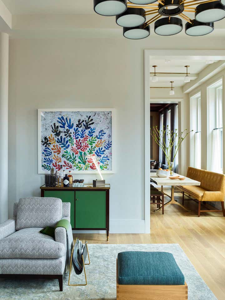 sink. Paired with a vintage factory pendant from Wyeth and Calico Wallpaper. The front Entry opens itself up to the central-core of the apartment and is the main transition between the public and private spaces. Dumais and the clients agreed this was the place for some major art to set the tone for a youthful and urban environment. To do
