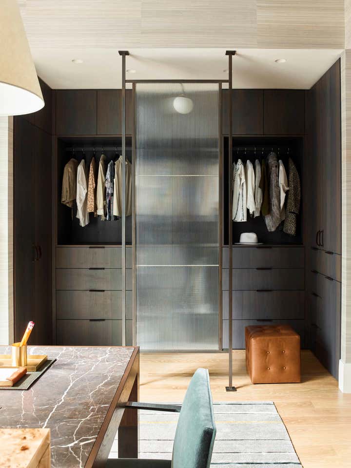 Dumais worked closely with Henry Built designing custom cabinetry for the Mud Room, Entry Hall and five closet systems in the Master Suite. We designed blackened steel and mirror doors to conceal three of the new closets along with a reeded glass partition to divide her closet from the study.