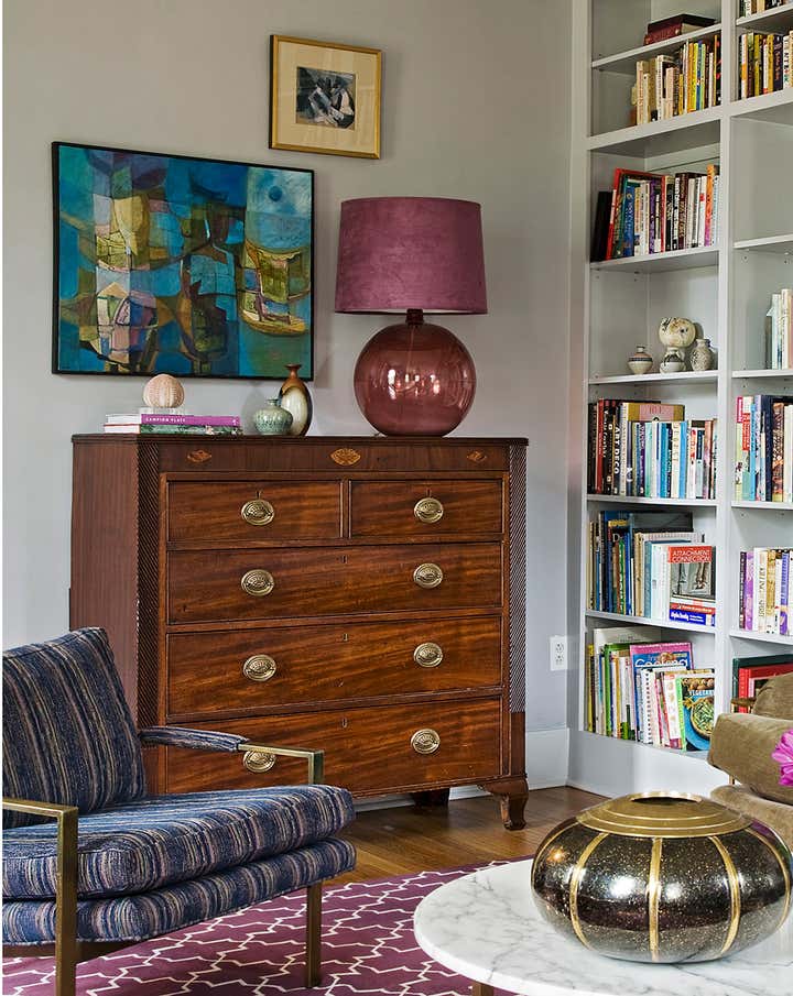 This 1940's home was designed for a family with two young girls. We maximized the space with comfortable furniture and soft fabrics as well unique color palettes and original furnishings and art. The living room works as a reading room and the dining room is used for homework and office work.