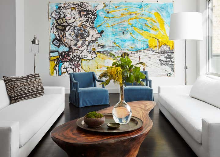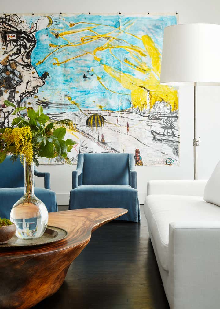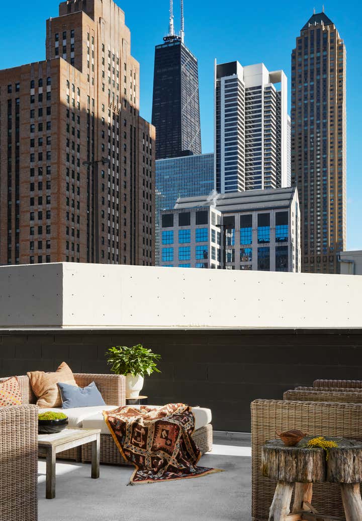 This renovated Chicago loft is approachable and comfortable, free of fuss or frill. Large-scale art collected by the owner and sculptural lighting figure prominently as do vintage furnishings and humble materials. Nothing however, compares to the skyline just outside.
