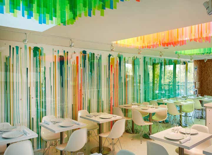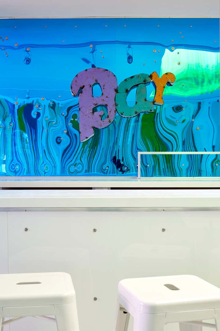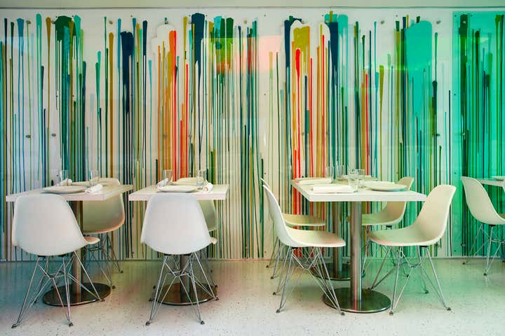 Meyer originally named the PVAC café Stripe based on an early design concept, even though he abandoned the original design, he thought the space still had to visually say “stripe”. The idea of a permanent drip painting on the main wall (forty-two feet long) became the new motif. Meyer spent 4 months creating the massive work on 3 layers of plexi-glass. The three layers of drips create a beautiful veiled effect. The main dining room is all white — Meyer sheathed the walls in white plexi attached with screws, washers and trimmed it in metal millwork—an homage to Tommi Parzinger. The front and back entrances are sheathed in particleboard. Meyer designed hanging light sculptures created out of thousands of sheets of clear heavy-gauge vinyl in five different colors. For the bar he found an old “Bar” sign at the Chelsea Flea Market one Sunday in New York, and the odd colors against the blue mirror were kind of perfect—a Jack Pierson moment.