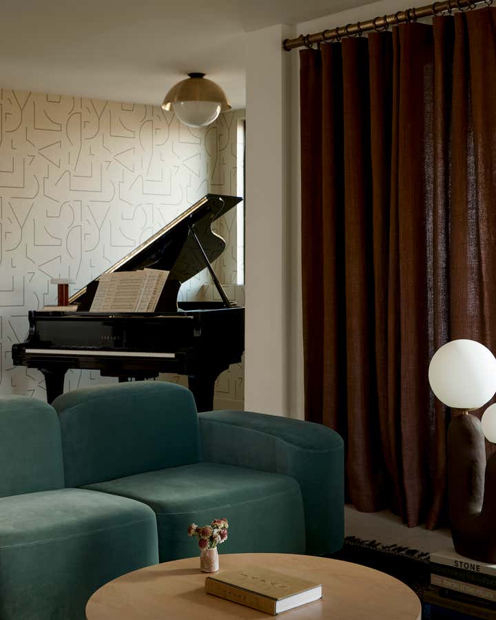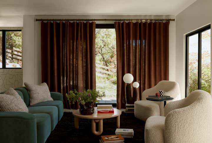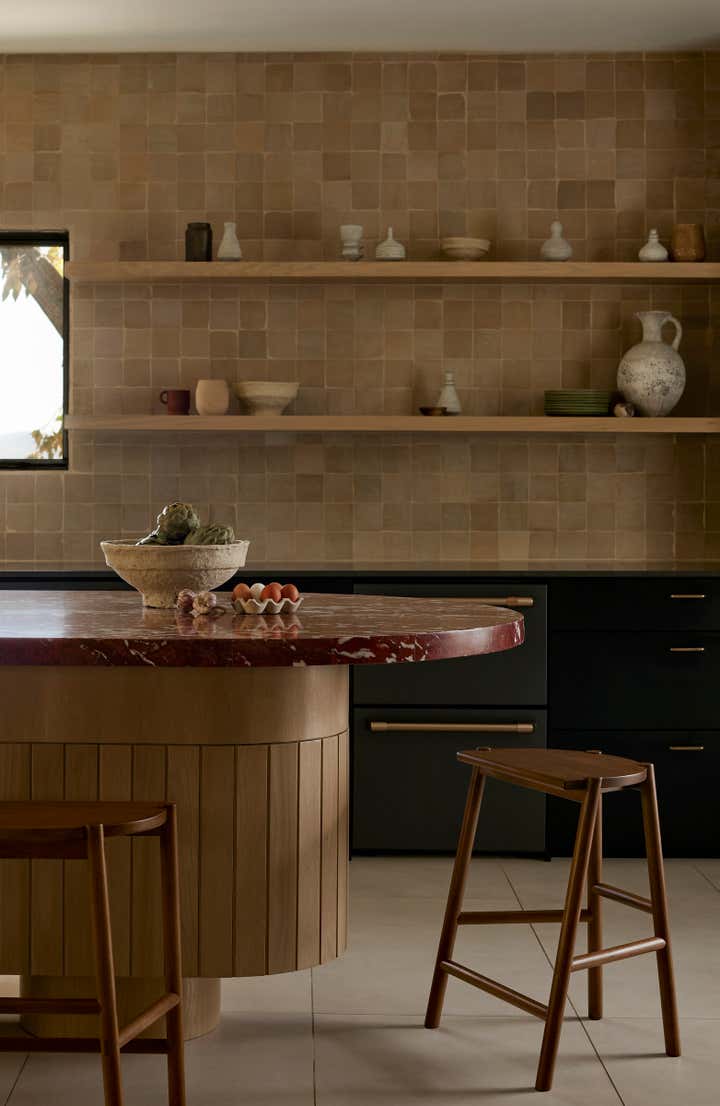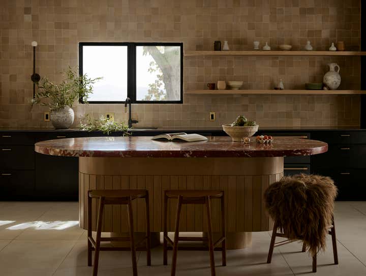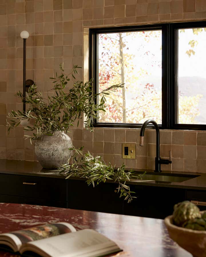 Tasked to choose finishes and furniture for a walk-out in Park City, it felt important to use warmth and texture to bring life to an otherwise blank slate. Since our clients' wish was to create a space in which to entertain family and friends, we added a pill shaped island in the cooking area and a dining space that could serve both as a place to work or a place to entertain. A color palette of maroons, blues, and beiges in textures of velvet, zellige, and boucle, helped create a welcoming and livable vibe.