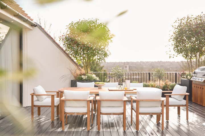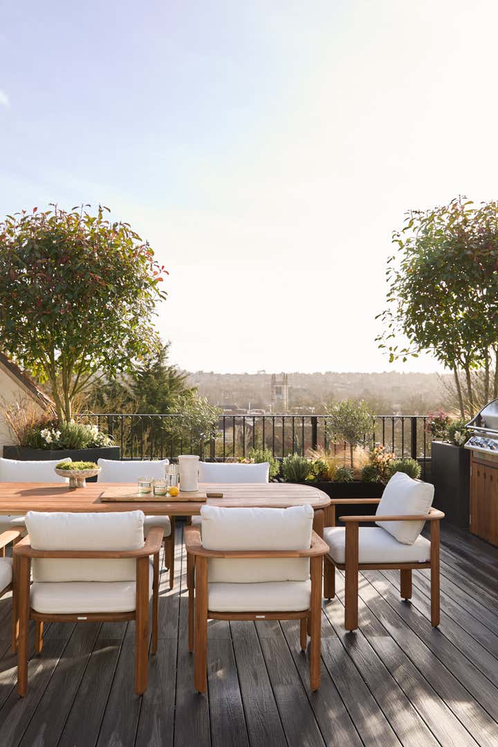 But the true centrepiece is the roof garden, quite literally a garden in the sky. Framed by mature oak trees, it feels cocooned and private, as though nature has wrapped itself around the home. And yet, beyond the canopy, the views open out, far-reaching sightlines across the Surrey Hills, shifting with the seasons and the light.