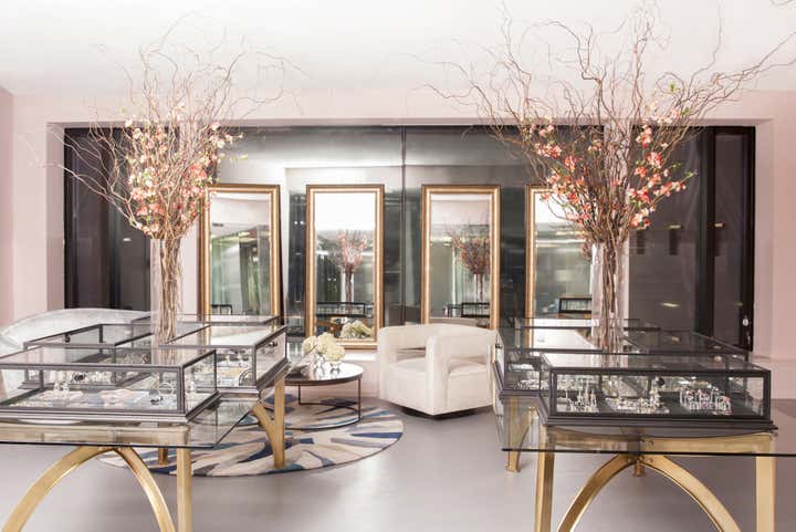 Cochineal turns a shop into a backdrop. Each room is monochrome, awash in creamy shades of one color. The walls, melting into themselves, are understated, drawing the eye instead to the showroom’s glittering glass cases. Seating areas with impactful armchairs allow for whispered conversations before deciding on a purchase.