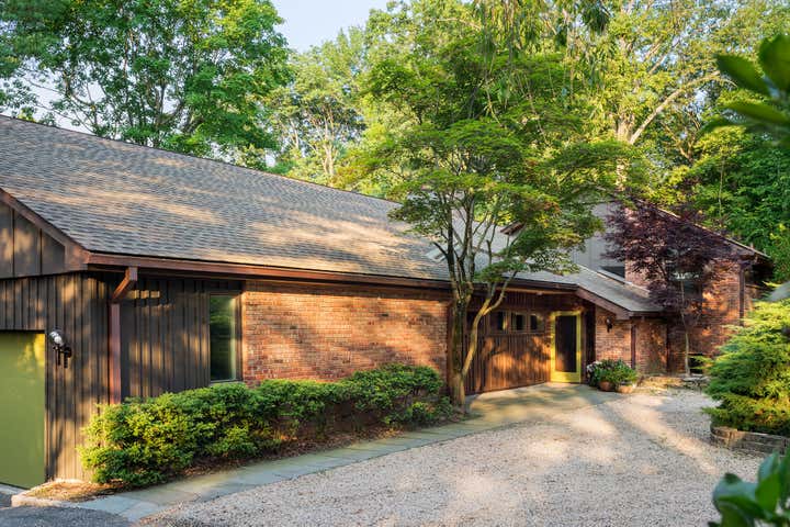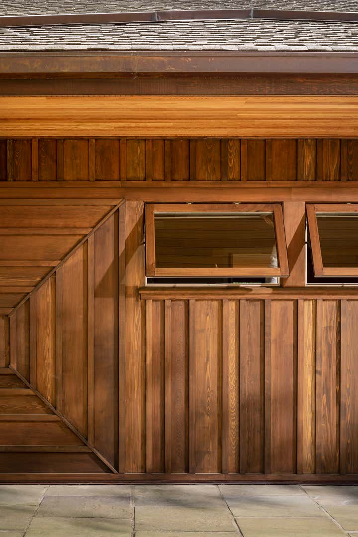 Originally designed by the architect Edgar Tafel in 1955, this house stretches away from the street along a ridge, looking out onto a rolling, rocky, wooded landscape. Natural light pours in through an enormous skylight in the primary living space, while ribbons of windows in every room provide the drama of the changing seasons as a backdrop to even the most quotidian activity inside. Our work involved a full restoration of the house's brick and wood exterior, a new roof and copper gutters, and the replacement of all those windows with historically appropriate but better-performing units. At the entry, painted plywood siding and soffits were replaced with stained cedar, a material Tafel had used on other projects, and the rhythmic board and batten siding at the remainder of the house was painted a deeper color to dissolve more naturally into the landscape. We also removed a small but unsightly ~1980s addition at the master bathroom, and designed a new master bathroom and dressing room within the house's original footprint, reusing elements of the original dressing room cabinetry in a more functional and efficient layout and sensitively introducing several new materials. Geometric cement floor tiles refreshingly pay homage to the midcentury aesthetic, while earthy Macchia Vecchia marble speaks to the dramatic landscape visible through the windows.