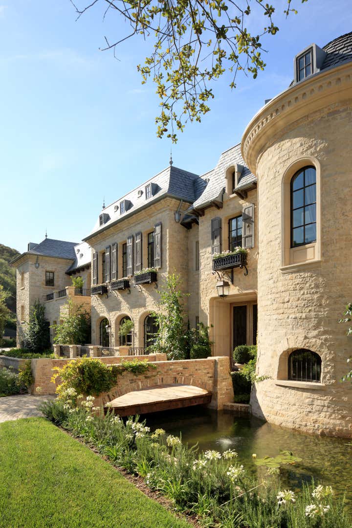 Inspired by old villages in Northern Europe, this home was designed to embody the traditional, rich feel of stone and wood, incorporating an indoor-outdoor California lifestyle and Eco-conscious technology. A naturalistic waterfall built into the hillside flows under a driveway bridge and creates a moat that wraps the front of the residence, and lush gardens surround the airy two-story library.