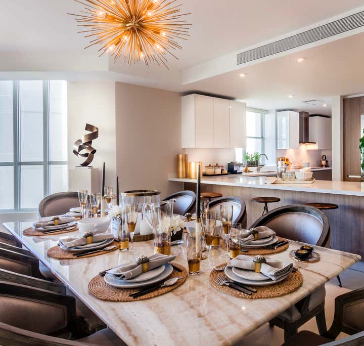 This home was inspired by the ocean view and the beautiful tropical sand incorporating those elements into the furniture, accessories and art. A beautiful mixture of textures and earth tones. The sputnik lamp brings a glow to the onyx dining table created for this project.