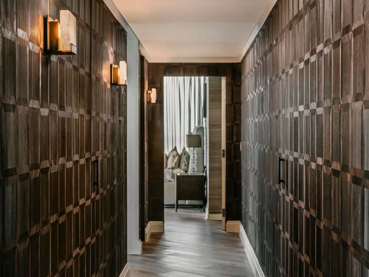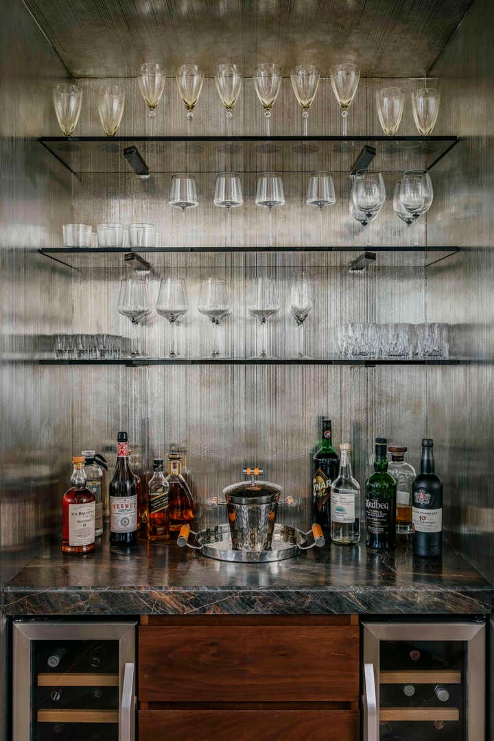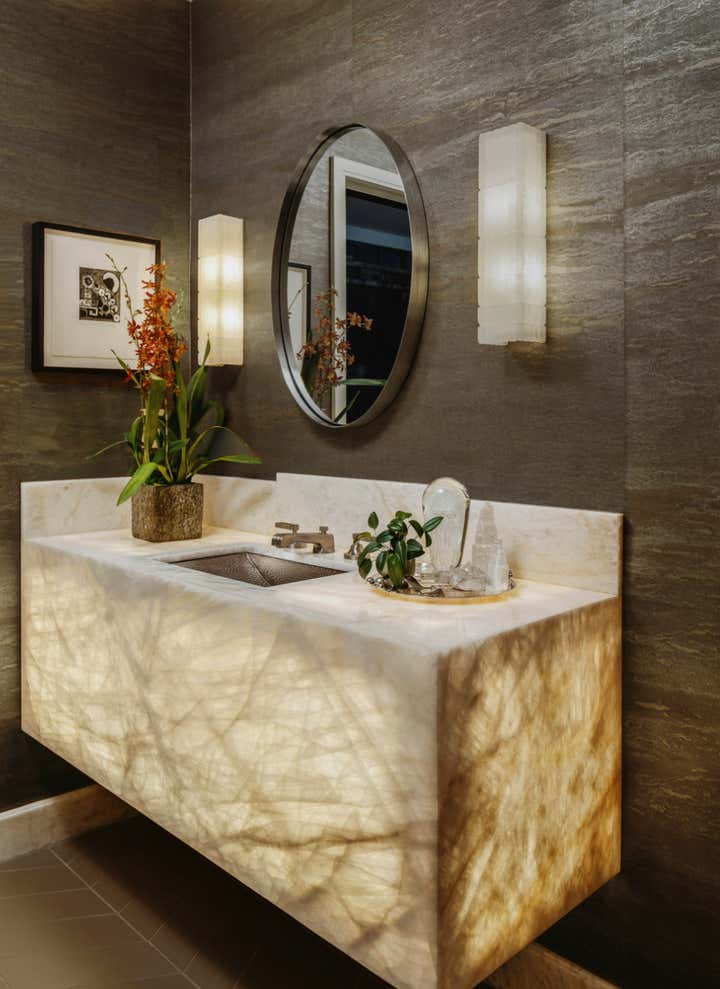 There are so many special moments in this home. We love the powder room with its suspended quartz vanity that lights when you enter the room, the fireplace with travertine selected to resemble tree trunks, the bar with its antiqued foil wallpaper, custom bronze shelf supports and beautiful marble and doors that are painted in faux grisaille.